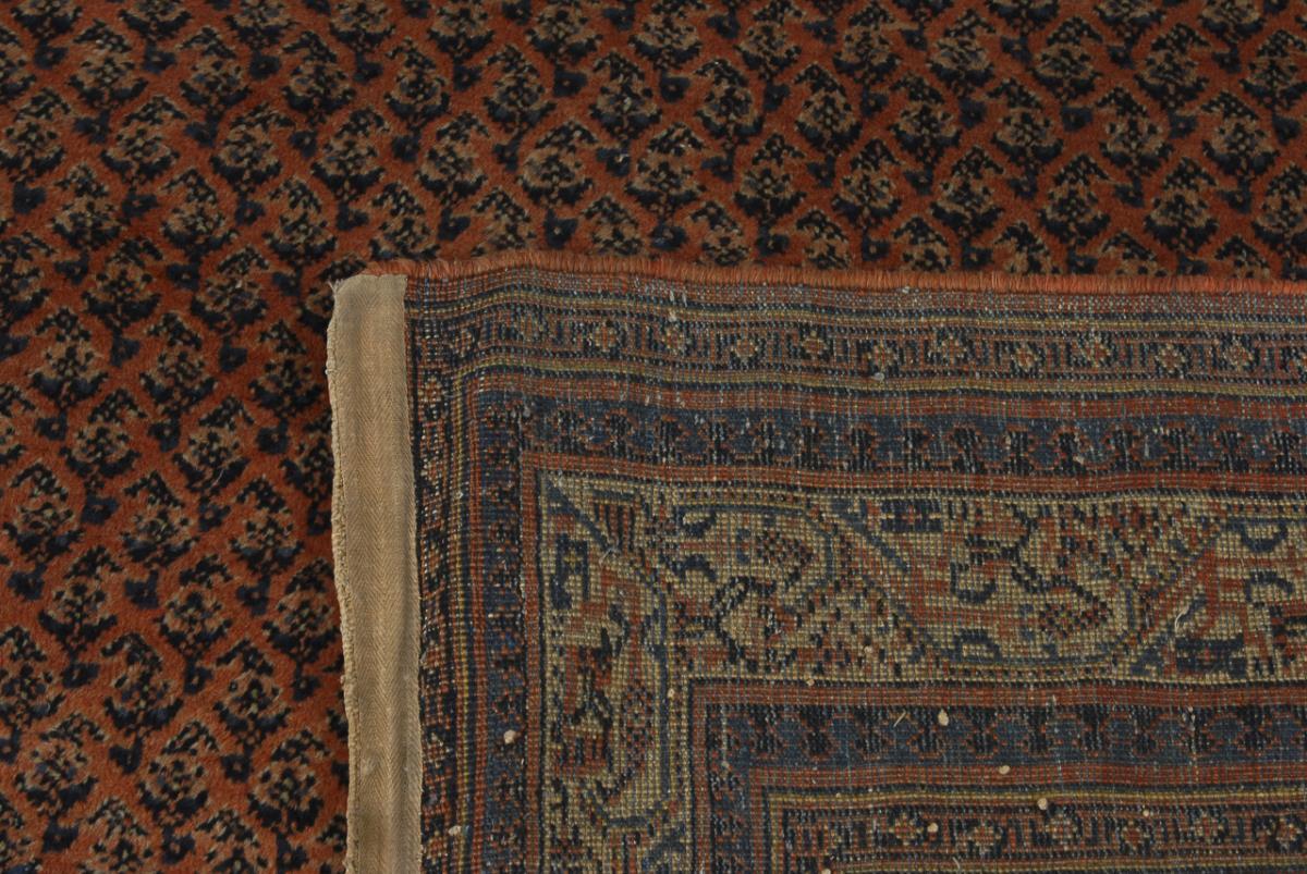 Middle field with boteh pattern covering the entire area, light corner gussets. Multi-row shikeli border with crenellated borders. Partially spotted, defective fringe and edge finishes.