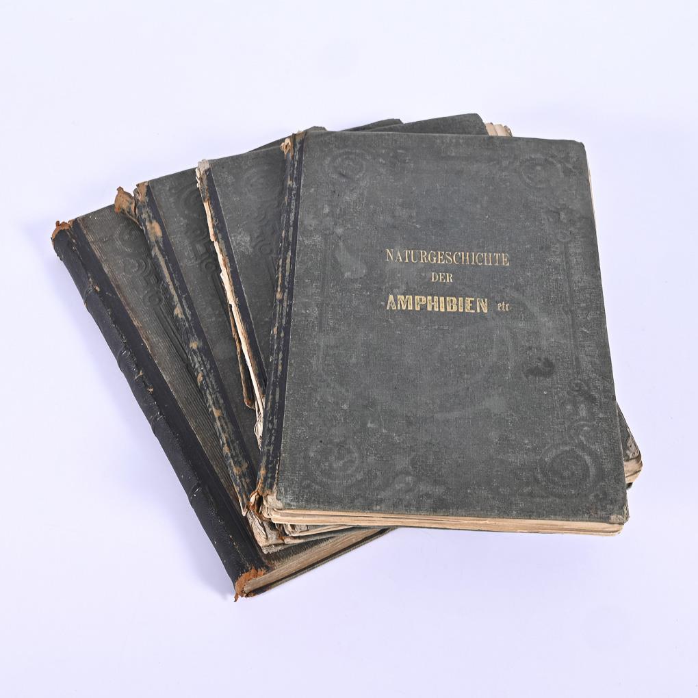 Rare, early edition of the widely used illustrative books, with even today fascinating, colored lithographs. "Natural history of amphibians, fish, mollusks and crustaceans, insects, worms and radiate animals" / "... of birds" / "... of mammals" / "... of the plant kingdom". With explanations in German and partly in French. In half leather binding. Strong signs of age and wear. Birds and amphibians: spine defective, block loose. Mammals: animal names inscribed by hand.