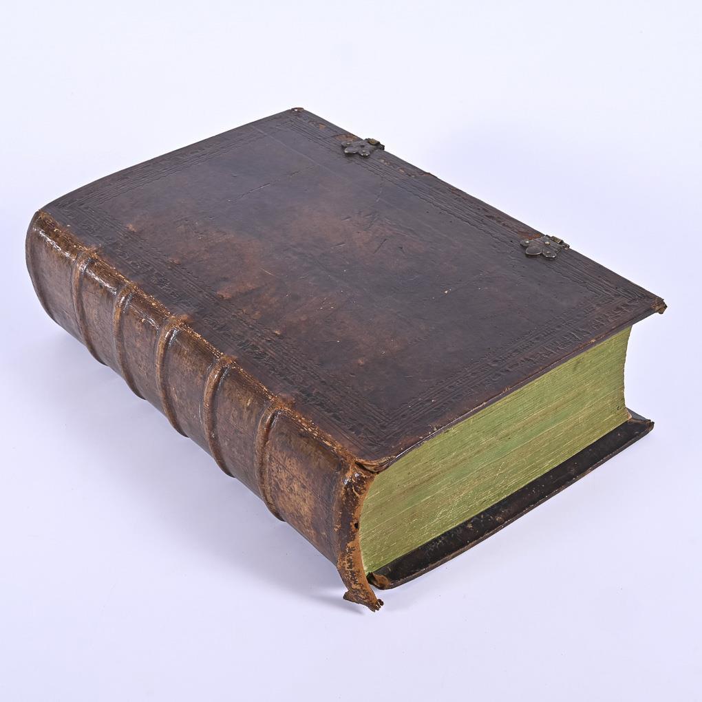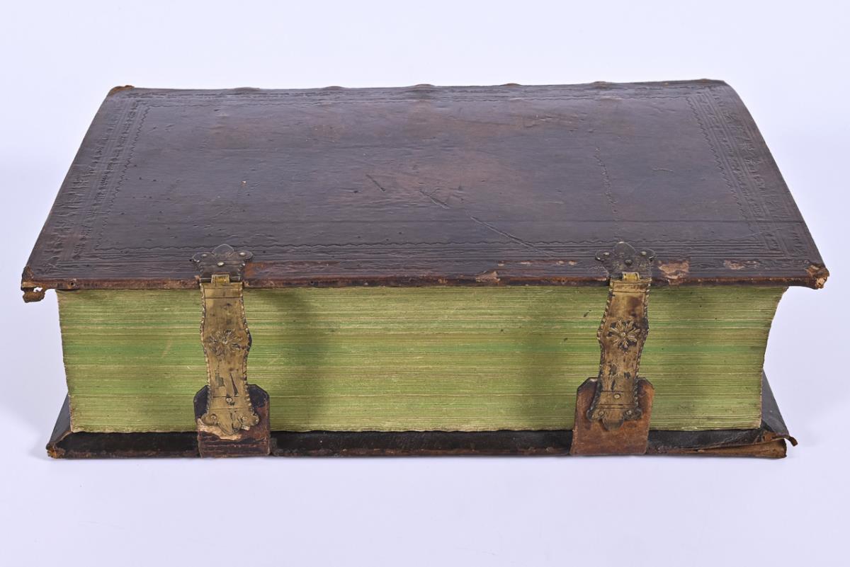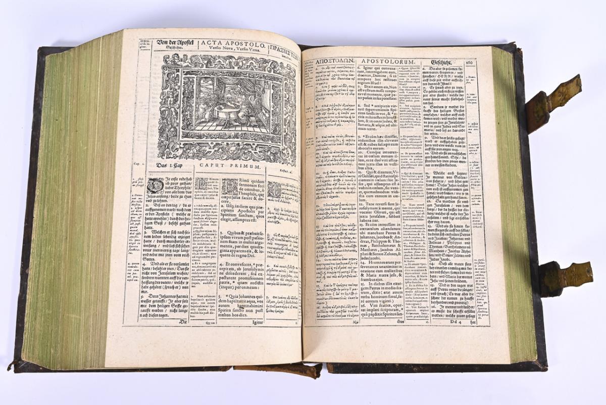Beginning with "Pars Quarta" (Prophet Isaiah) to Revelation John and register. Intertitles for parts 4, 5 and 6 present and for the New Testament. Leaf count: 295, (1), 218, 35, (1), 205, (1), 153, (15). With 91 woodcuts. Bible translation in ancient Greek (Septuagint), two Latin translations (after Pagnini) and once German in the Luther translation. Placed side by side in columns as well as two additional commentary columns. In old, but probably not of the time, leather binding with clasps, green cut. Ca. the first half of the book has numerous quantitatively decreasing traces of fraying, but only in the form of holes, therefore not noticeable on the pages. Leather binding with small missing parts, spine torn at the bottom.