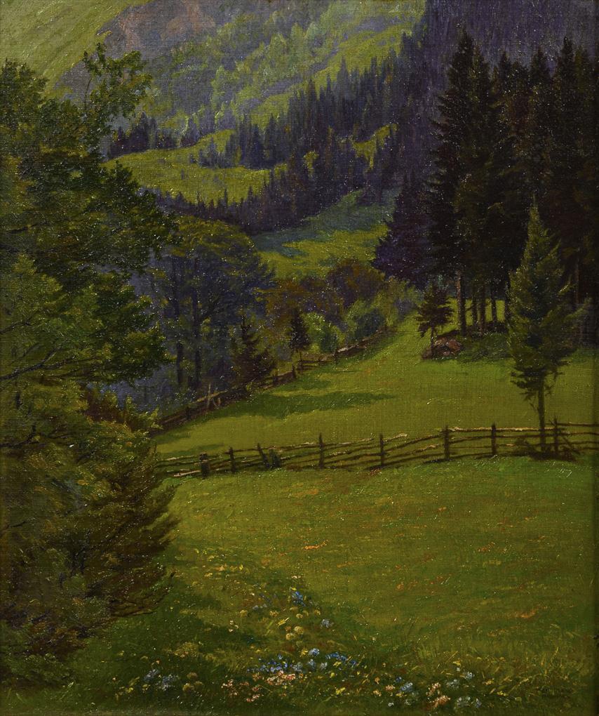Mountain landscape with flowering meadow between firs. Traces of age.