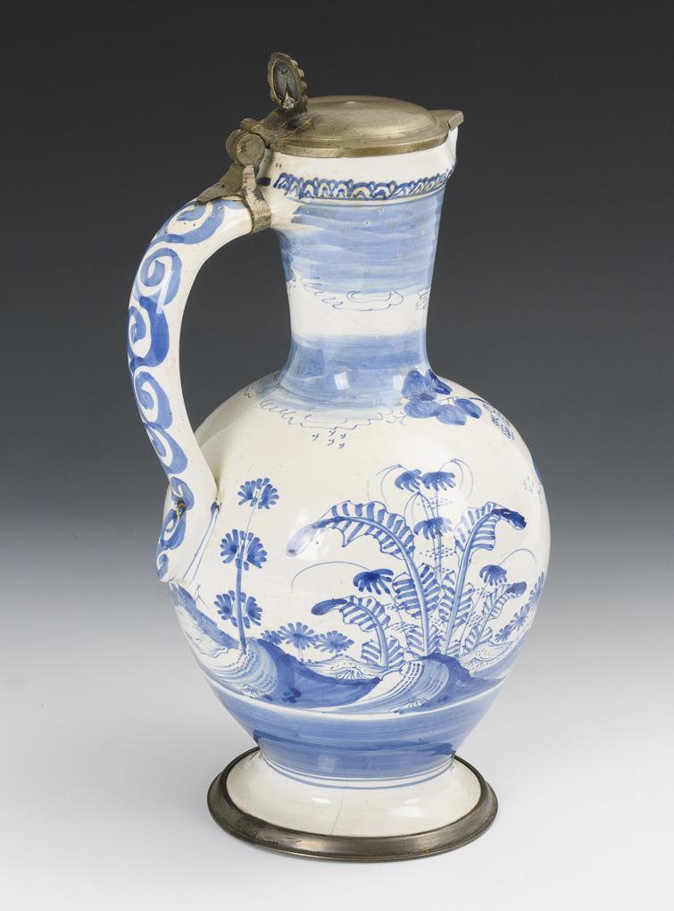 Sphere bellied jug with round base and spiral decorated ribbon handle. Wall with architectural depiction, large trees and stylized plants. Pewter lid with shell pusher and linen stain, pewter stand ring. Slight glaze rubbing and bumping, defects and repairs on the pewter, slightly glaze cracked on the stand.