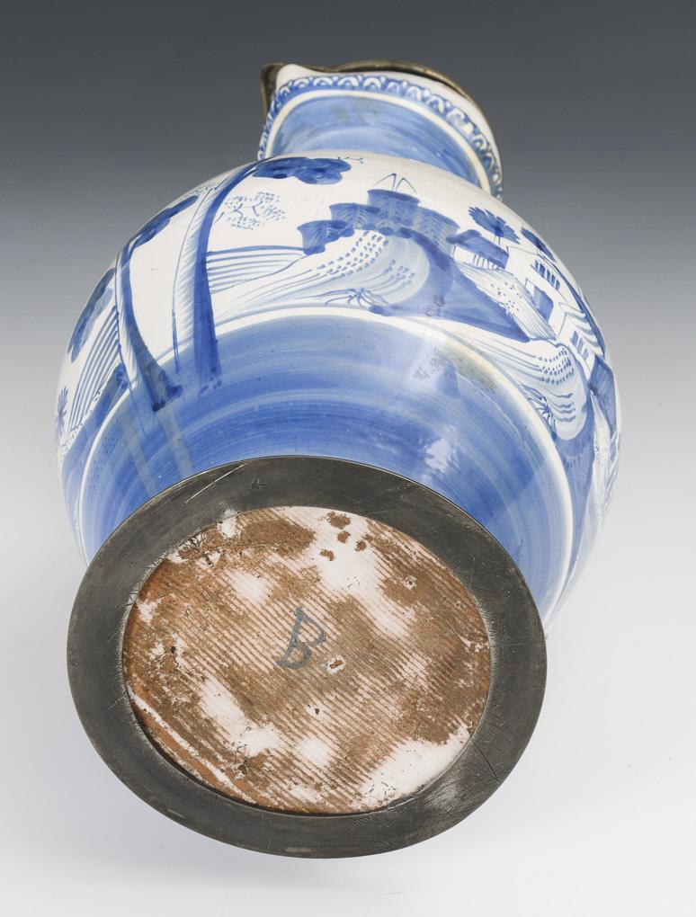 Sphere bellied jug with round base and spiral decorated ribbon handle. Wall with architectural depiction, large trees and stylized plants. Pewter lid with shell pusher and linen stain, pewter stand ring. Slight glaze rubbing and bumping, defects and repairs on the pewter, slightly glaze cracked on the stand.