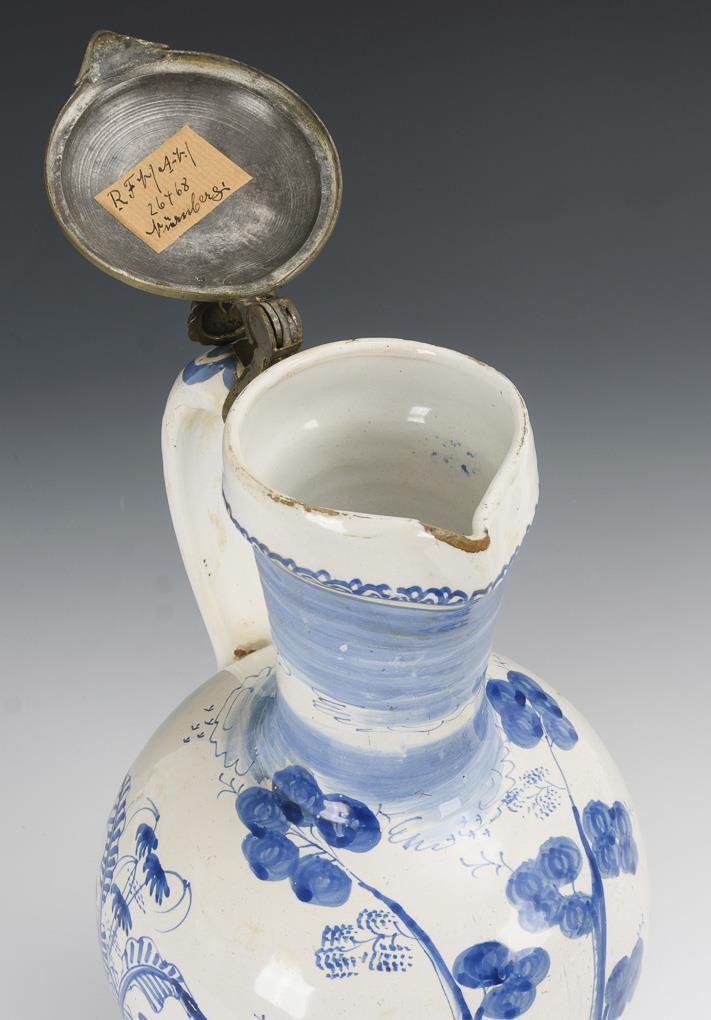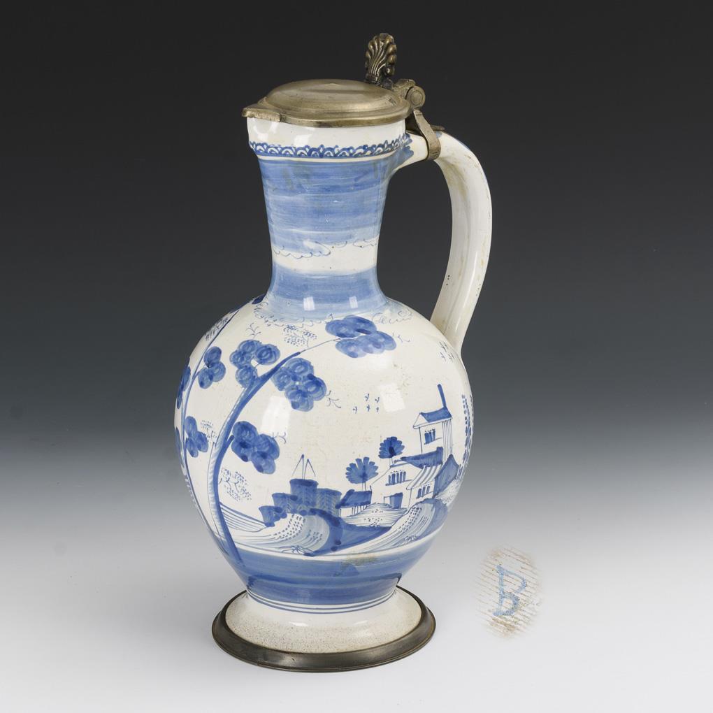Large baroque faience narrow neck jug with architecture in landscape. Hanau.