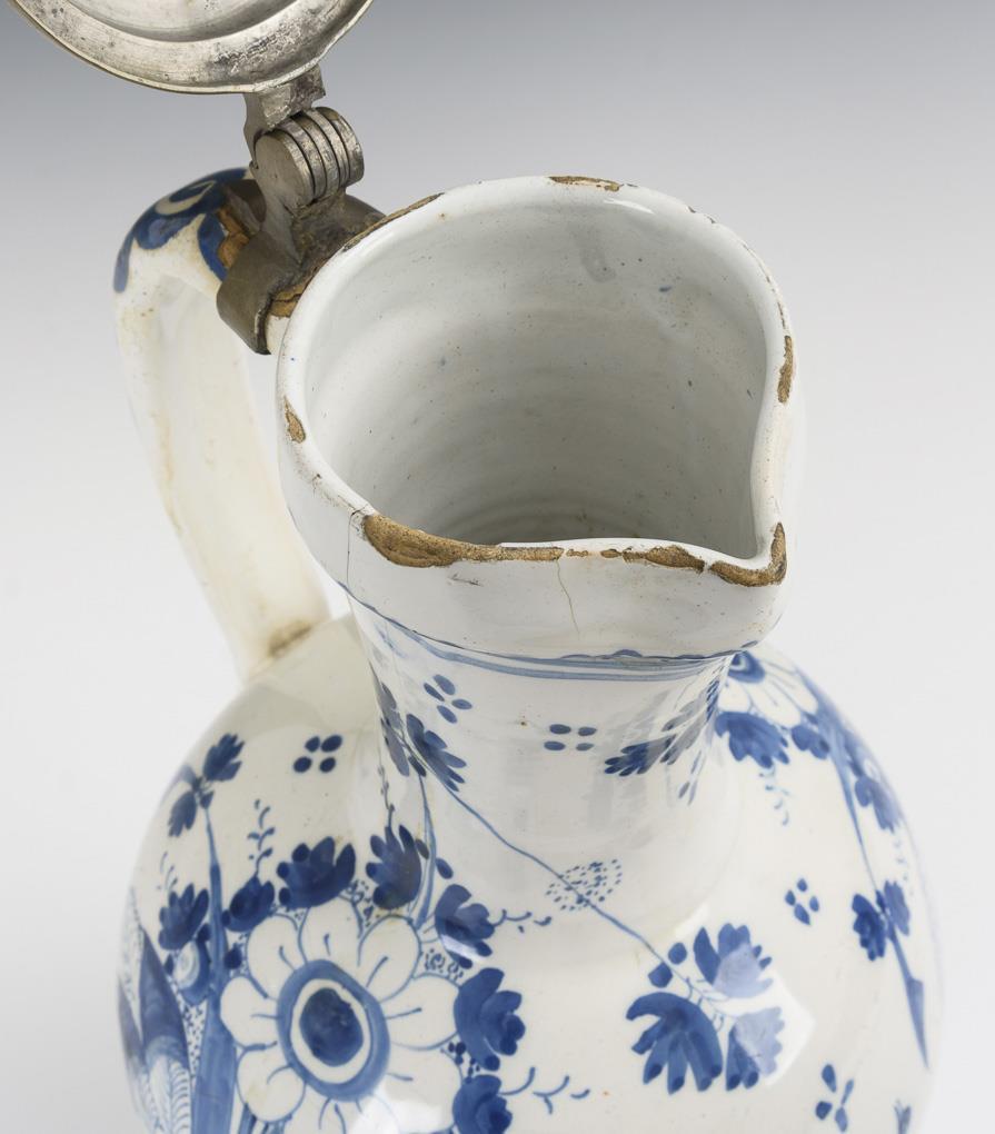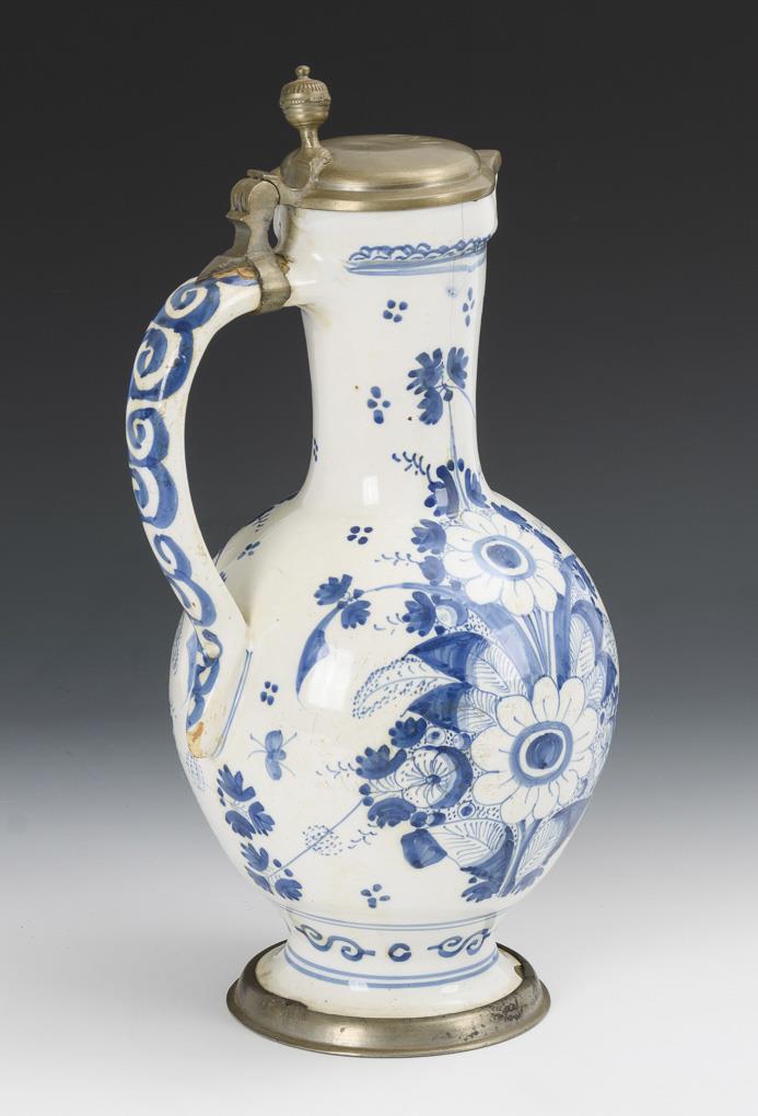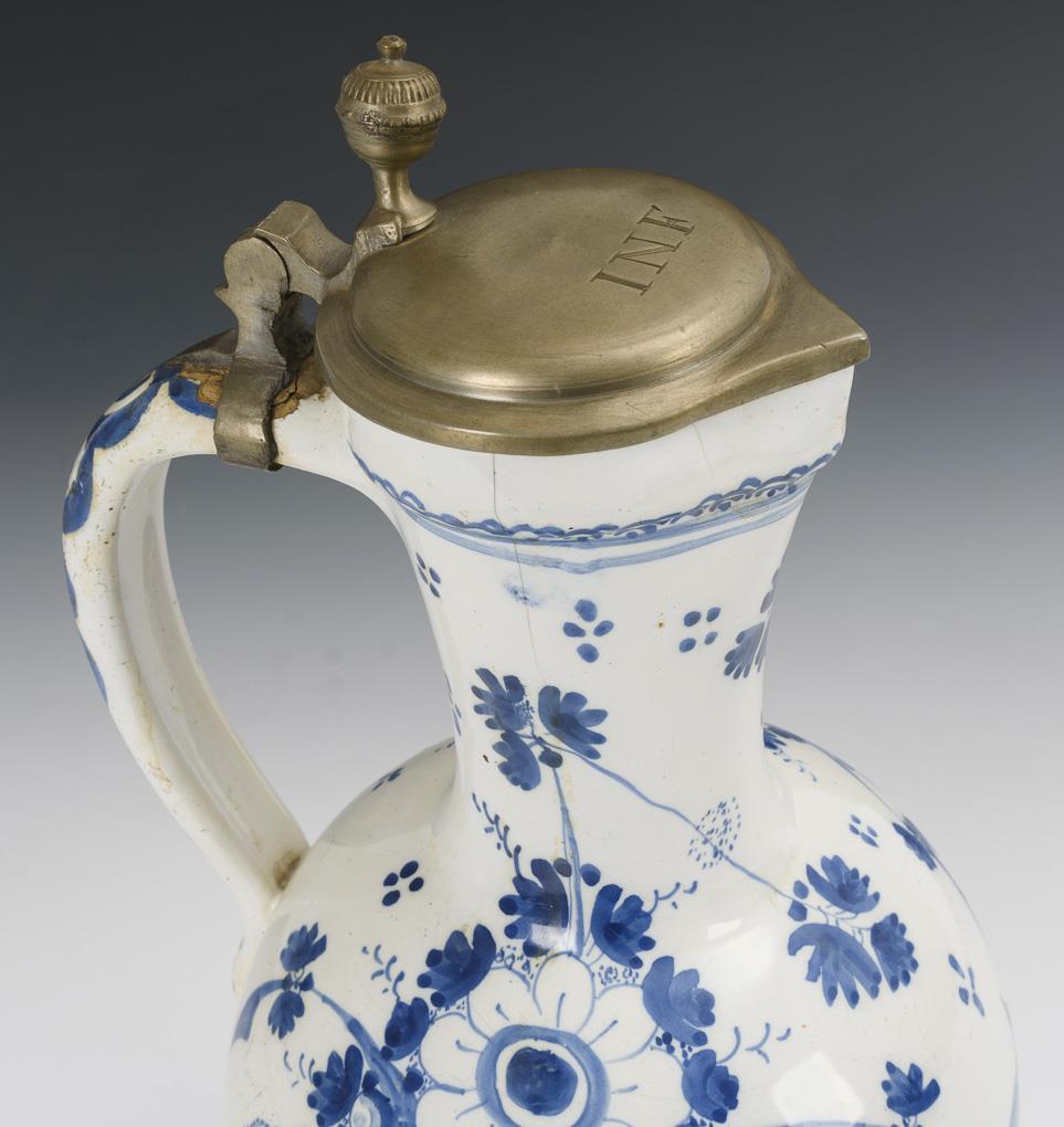 Spherical bellied jug with round base and spiral decorated ribbon handle. Wall decorated with two large floral bouquets and a small bird. Pewter lid with urn pusher engraved "INF", pewter stand ring. Slight glaze rubbing and bumping, bumped at the stand.