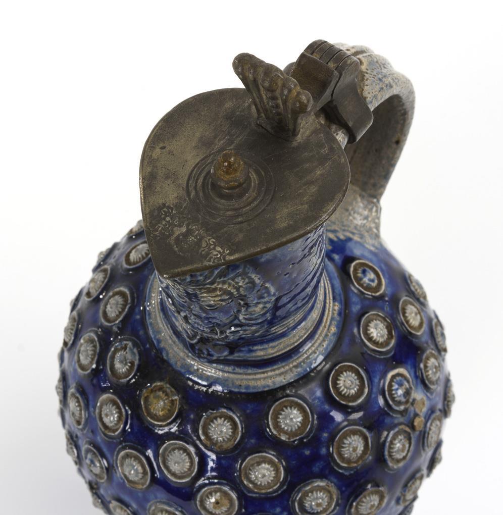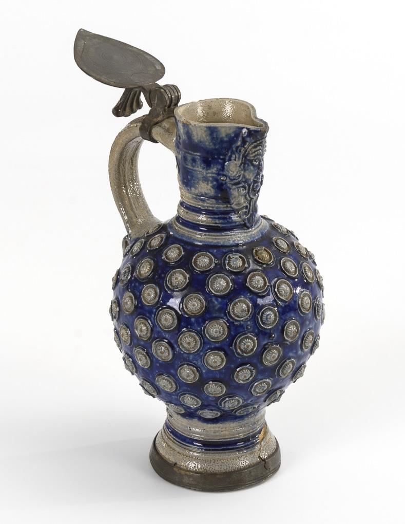 Narrow-necked jug with spherical belly and 10 rows of applied small rosettes, stepped neck with lion's paw and stepped round stand, fluted ribbon handle with scrolled base. Pewter lid with urn decoration and shell pusher, et al. hallmarked, pewter stand ring. Partially slightly bumped, defective at the stand and restored.