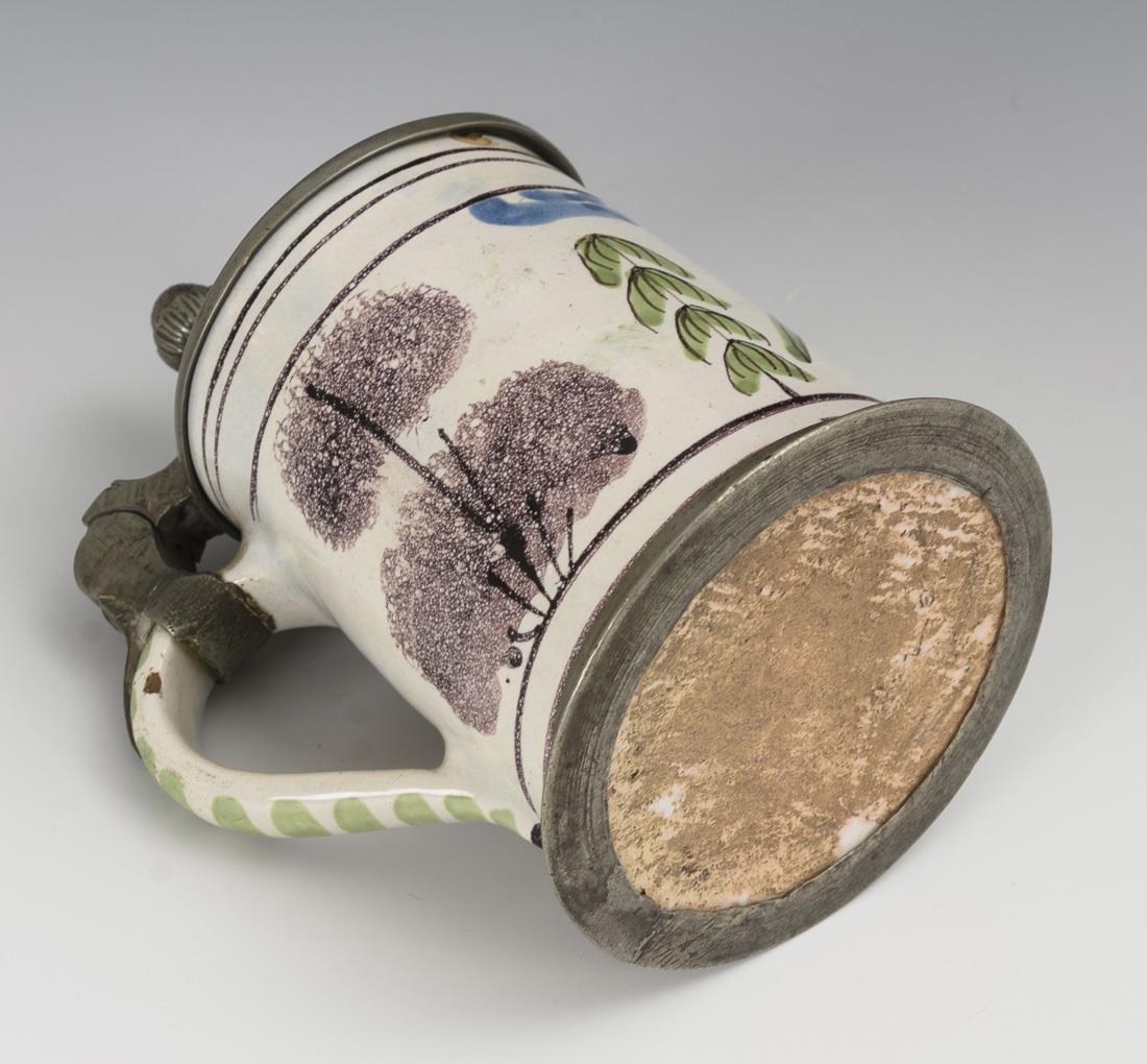 Cylindrical jug with line decorated ear handle. On the front a rock with bird flanked by trees. Pewter lid with acorn pusher, engraved "MAM", pewter stand ring. Partially slightly bumped.
