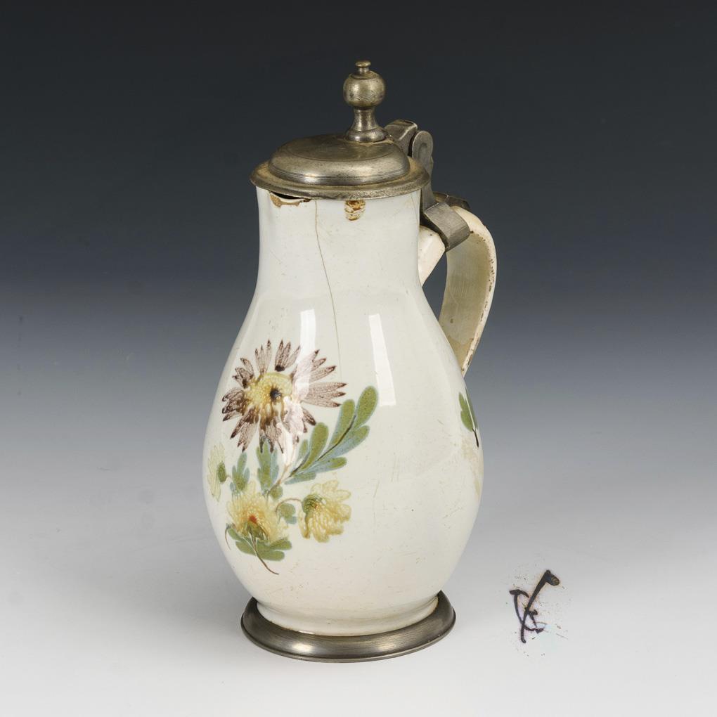 Pear jug with ear handle and floral painting. Pewter lid with ball pusher, pewter stand ring. Restored, with defects.
