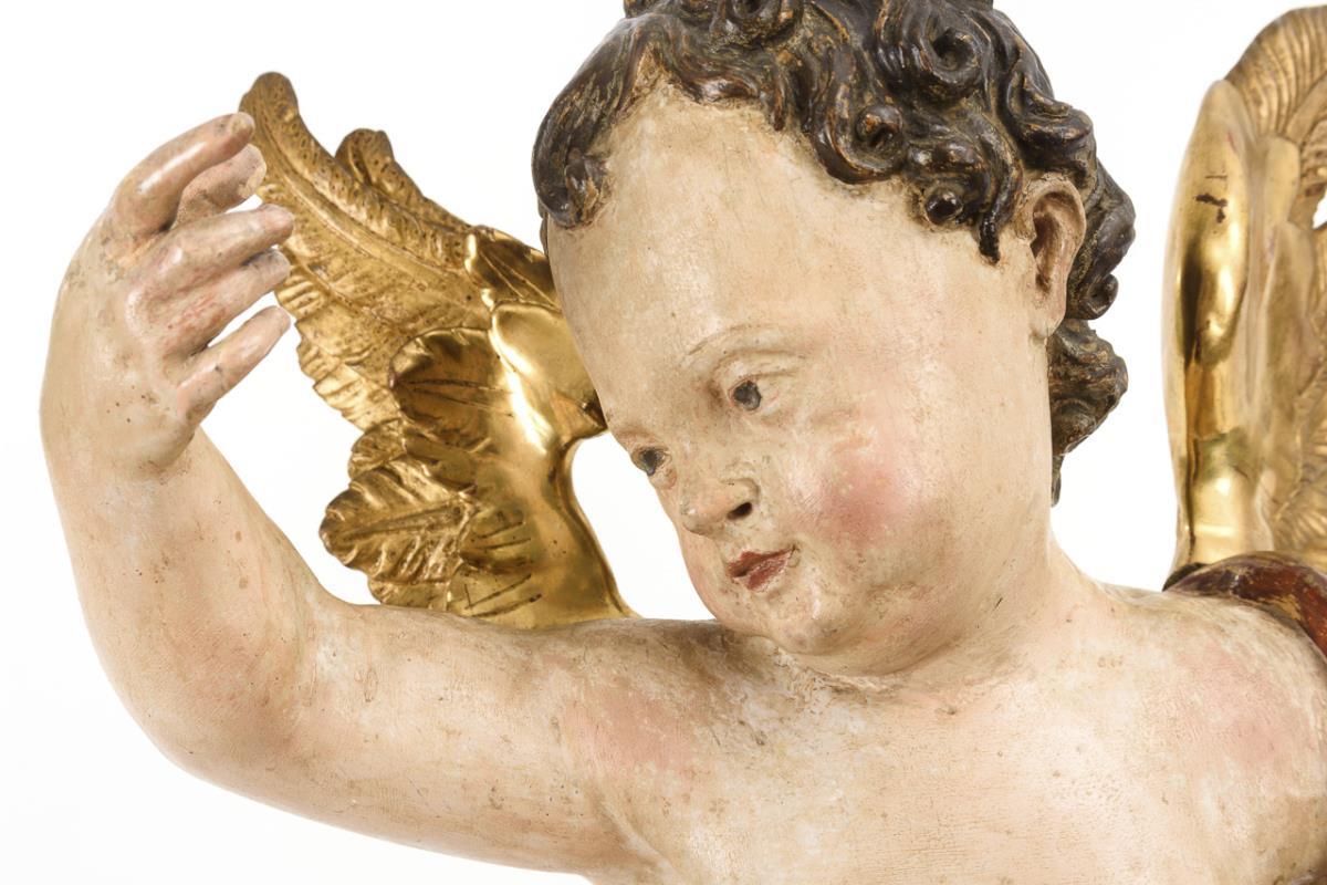 Fully sculptured angel with fluttering loincloth pointing floating up. 1 finger and 2 toes glued, setting largely gone over, gilding rubbed, otherwise minor signs of age/use.