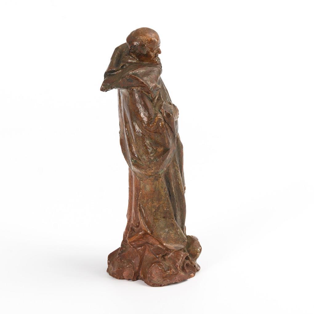 Fully sculpted standing figure of a pensive monk. Scarcely any signs of age/use.