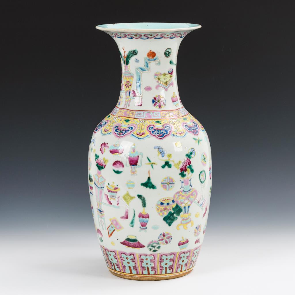 Dekor mit kleinteiligen symbolischen Gegenständen des Buddhismus. Hellgrüne Innenglasur.