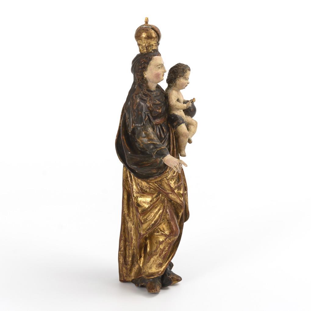 Full-sculptured standing figure of crowned Mary in an exceedingly richly folded cloak. In her left she carries the naked baby Jesus with loincloth, which in turn holds the globe, while his right is raised in speech gesture. Few signs of age / use, version passed over.