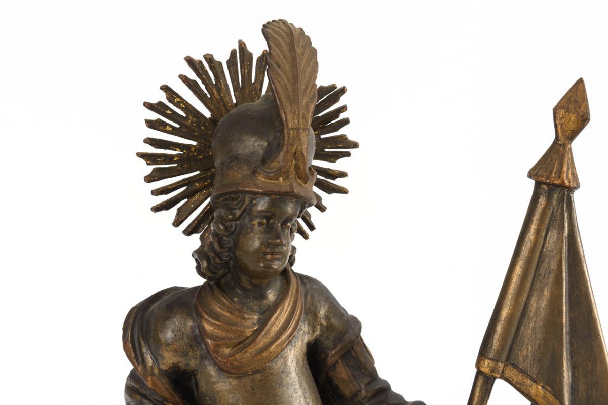The saint in armor with flag and ray nimbus extinguishes with a bucket the burning house. On carved original base with volutes and empty cartouche. 1 thumb missing, silvering blackened, patinated, otherwise little signs of age / use.