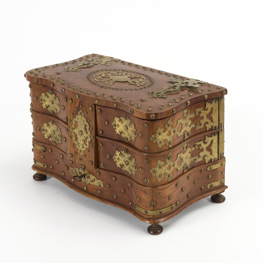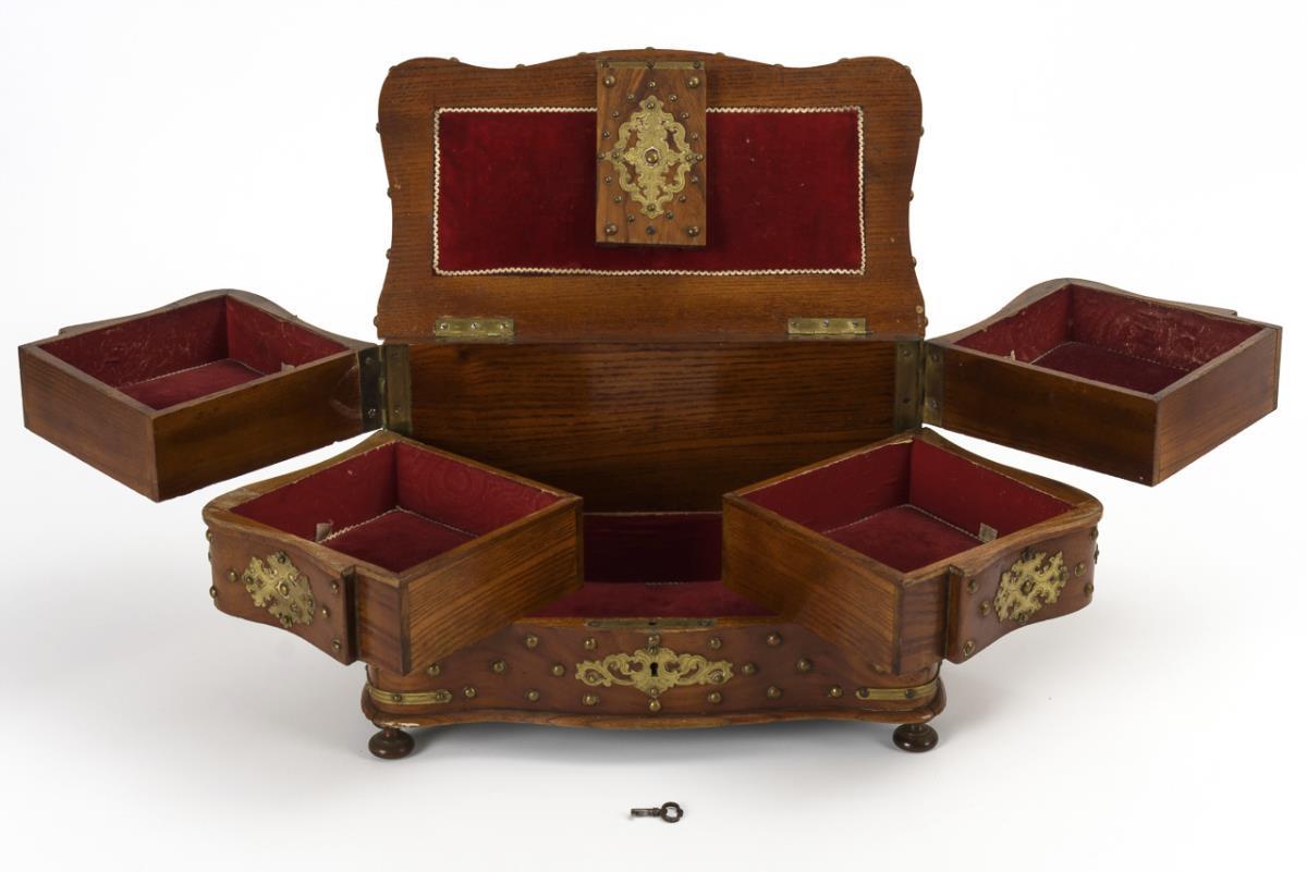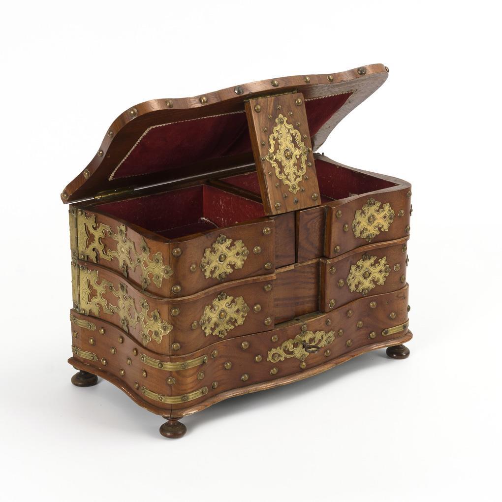 Casket decorated on all sides with ornamental fittings and cloutage. With hinged lid open, 4 side swinging out compartments above fixed hollow compartment. brass partly detached, partly missing parts, minor damage to the paper.