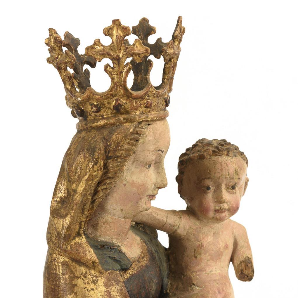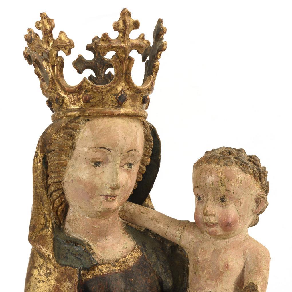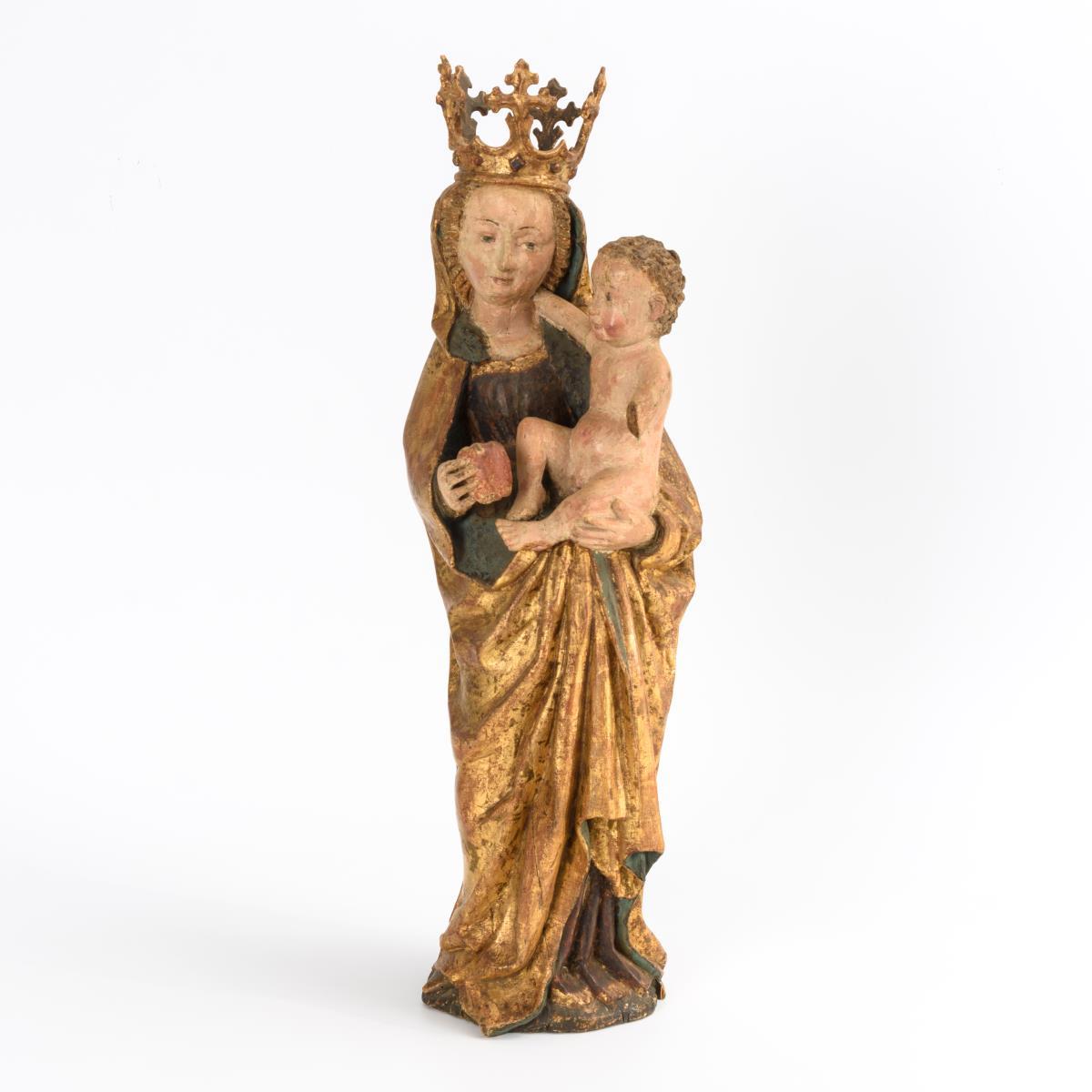 Full-sculptured standing figure of crowned Mary in pronounced Gothic swing. With her left hand she holds the naked infant Jesus, who has lovingly placed his arm in his mother's neck, while with her right she hands him an apple. 1 lower arm of Jesus missing, missing part at the plinth and at the hem of the robe, 1 dry crack at the bottom, otherwise minimal dry cracks, minimal traces of anobia, setting gone over and rubbed.