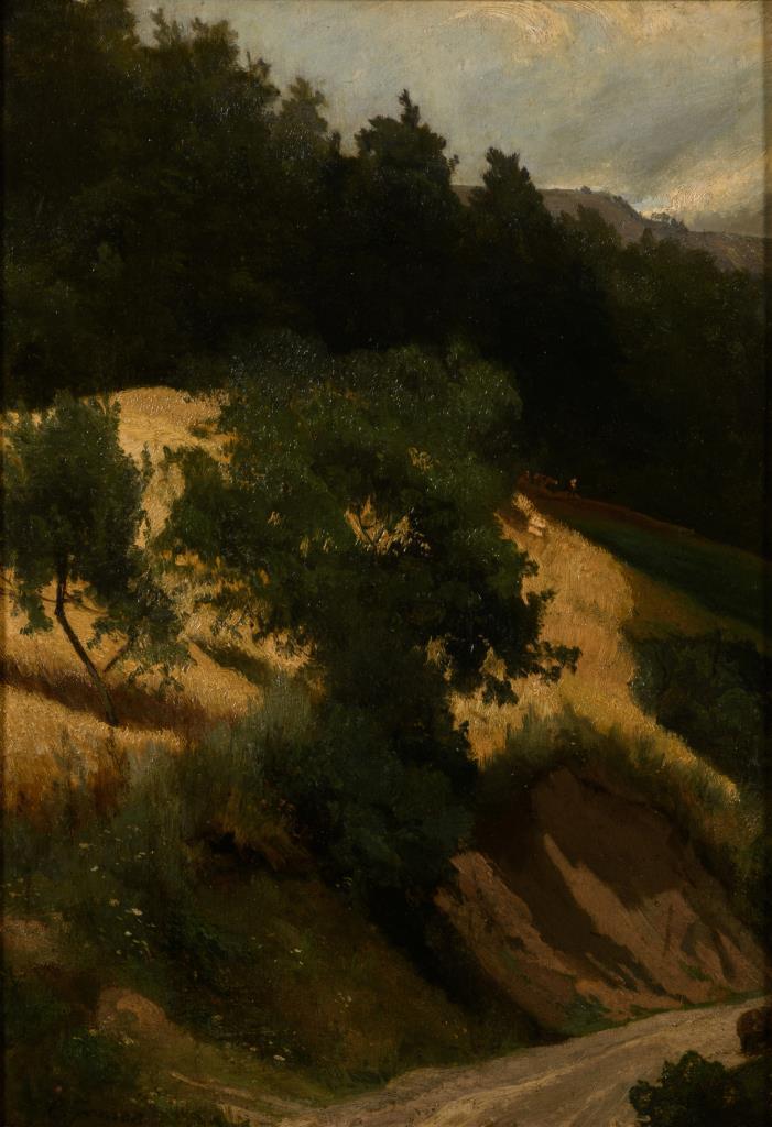 Sonniger Weg unterhalb eines Hanges am Waldrand mit gelbem Korn.