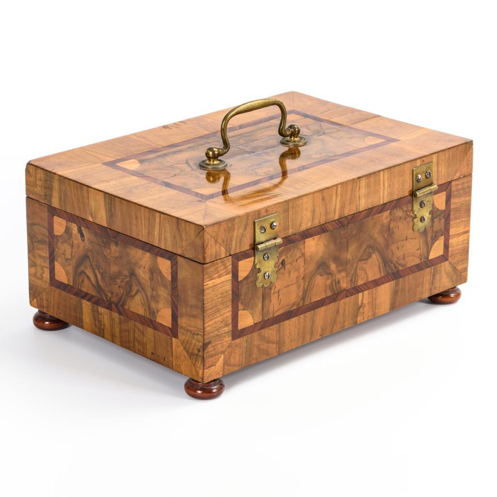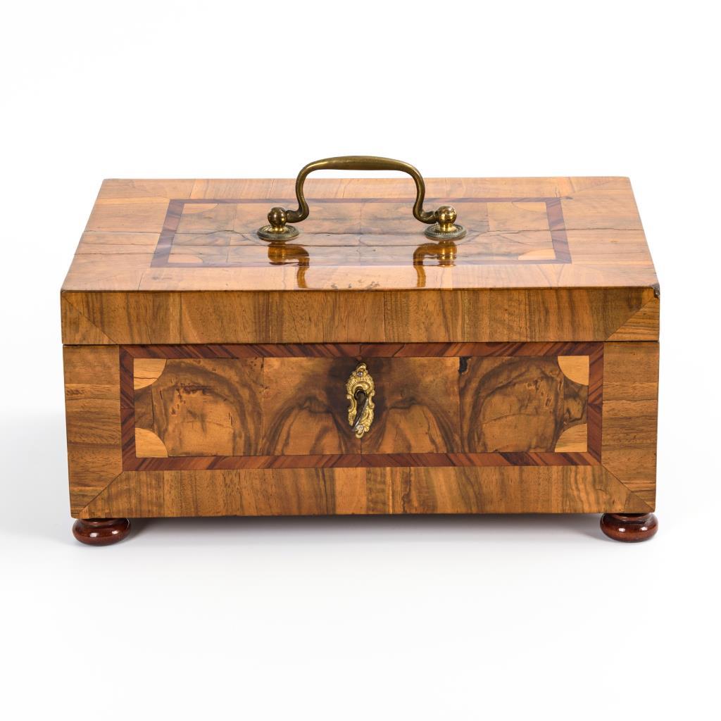 Quaderschatulle allseits und auf dem Scharnierdeckel mit Tragegriff scheinkassettiert. Innen neu mit rotem Marmorpapier ausgeschlagen. 1 Schlüssel. Füße und Schlüssellochblende ergänzt, Trockenrisse am Deckel, sonst wenige Alters-/ Gebrauchsspuren.