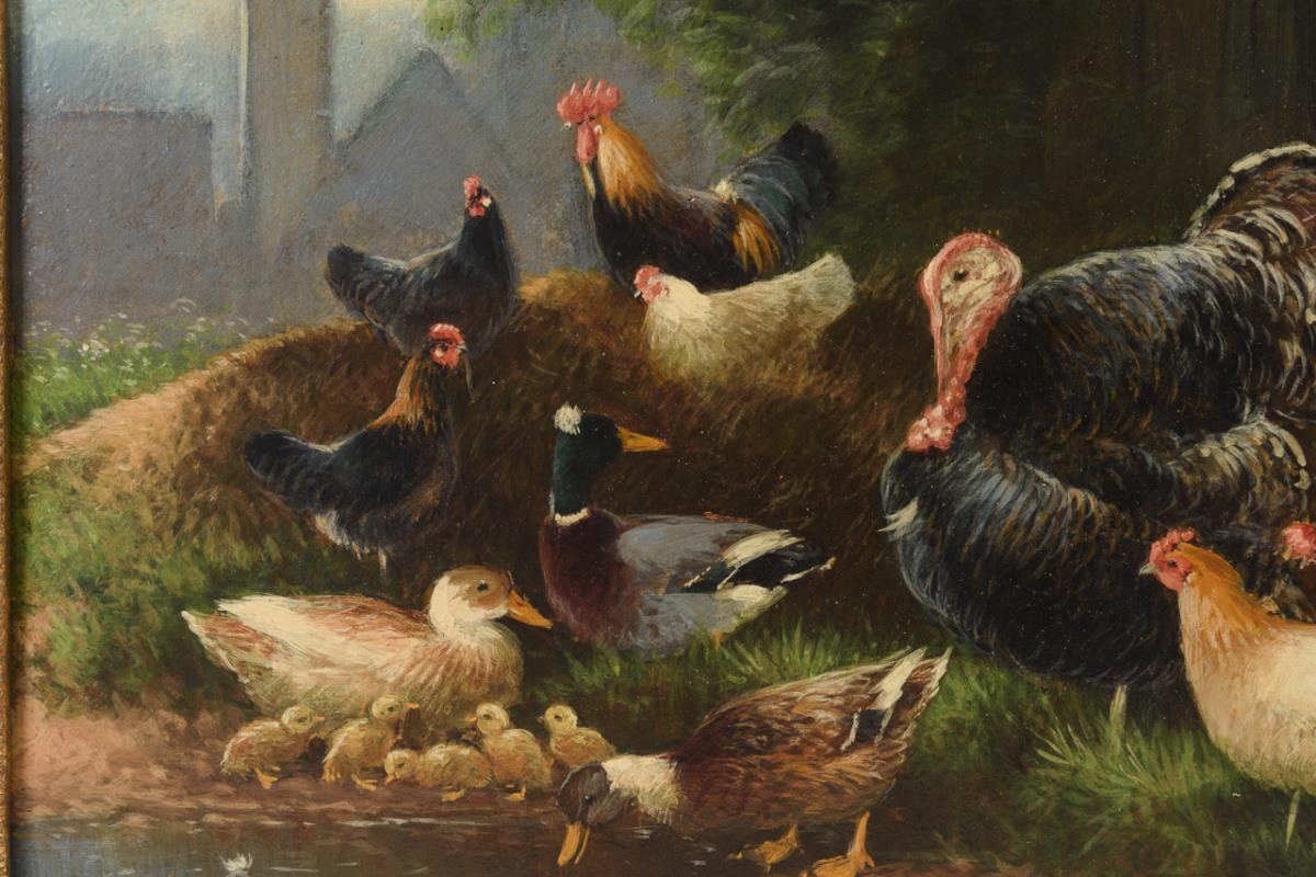 Ducks, chickens and the cock on the shallow bank of a pond near the barn.