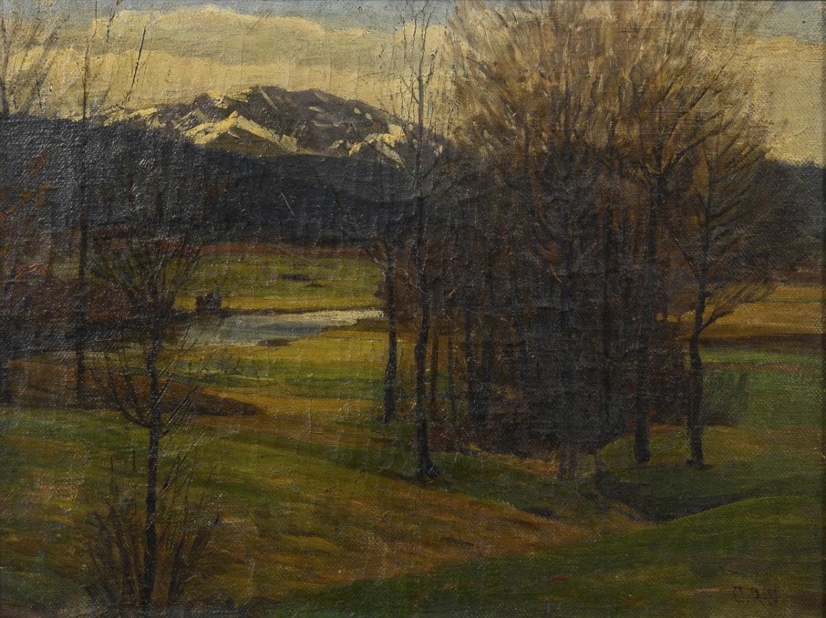 Bare groves of trees by a stream against the mountains covered with snow on the horizon. Traces of age.