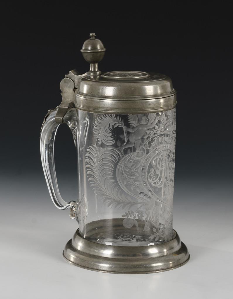 Roller jug with ribbon handle as well as pewter mounted stand and hinged lid with acorn pusher and coin. On the front the richly engraved representation of a crowned heart surrounded by rocailles with the inscription "Lieb du mich / Wie ich dich" and two ligatured monograms; with demolition. Pewter mount on the stand somewhat loose.