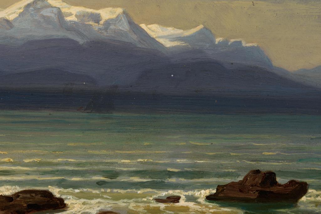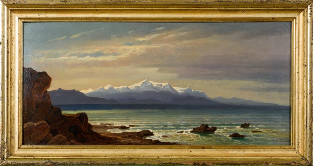 Stimmungsvoller Meerblick von einer felsigen Küste über die Bucht zu den mit Schnee bedeckten Gipfeln am Horizont.