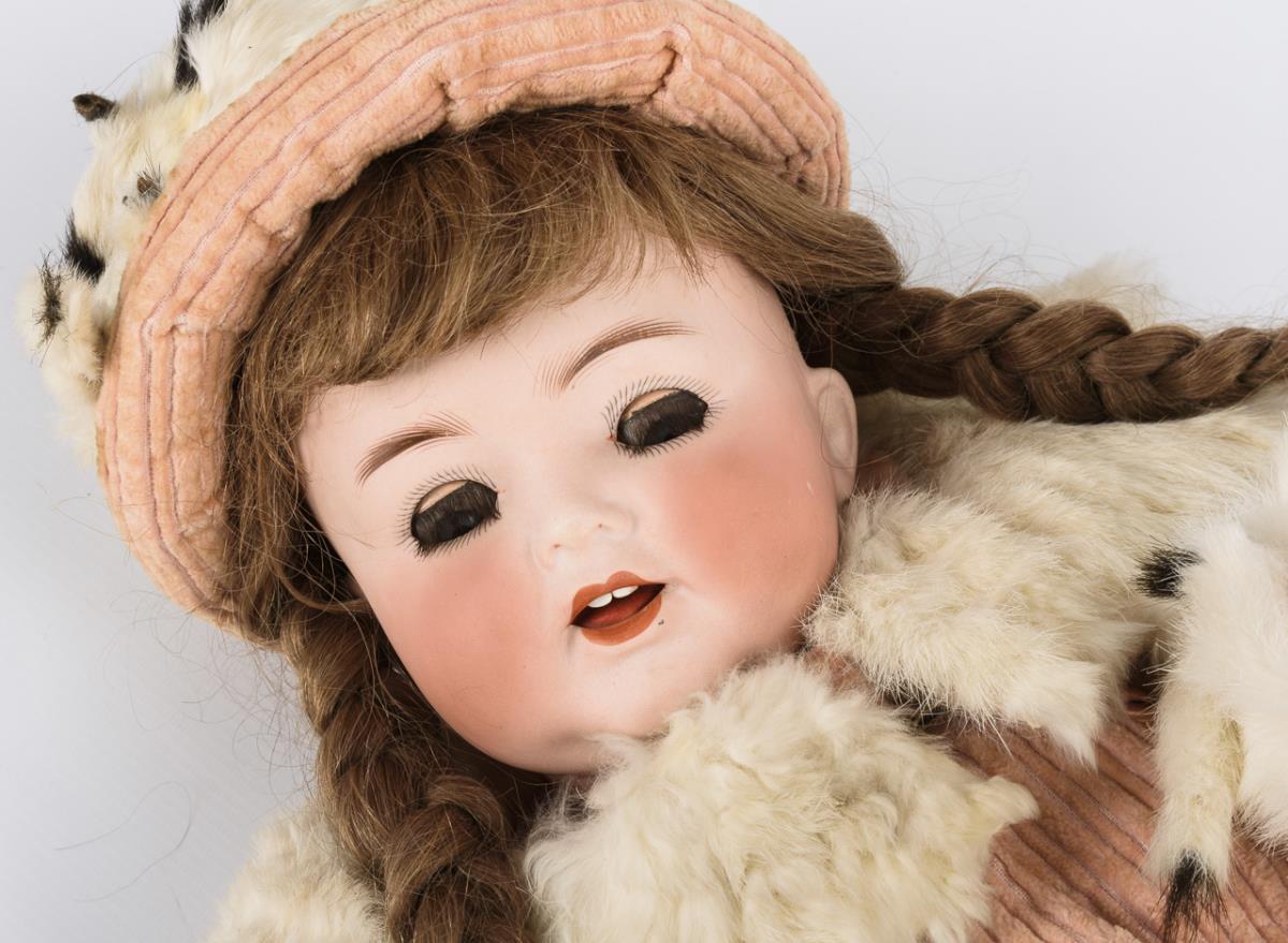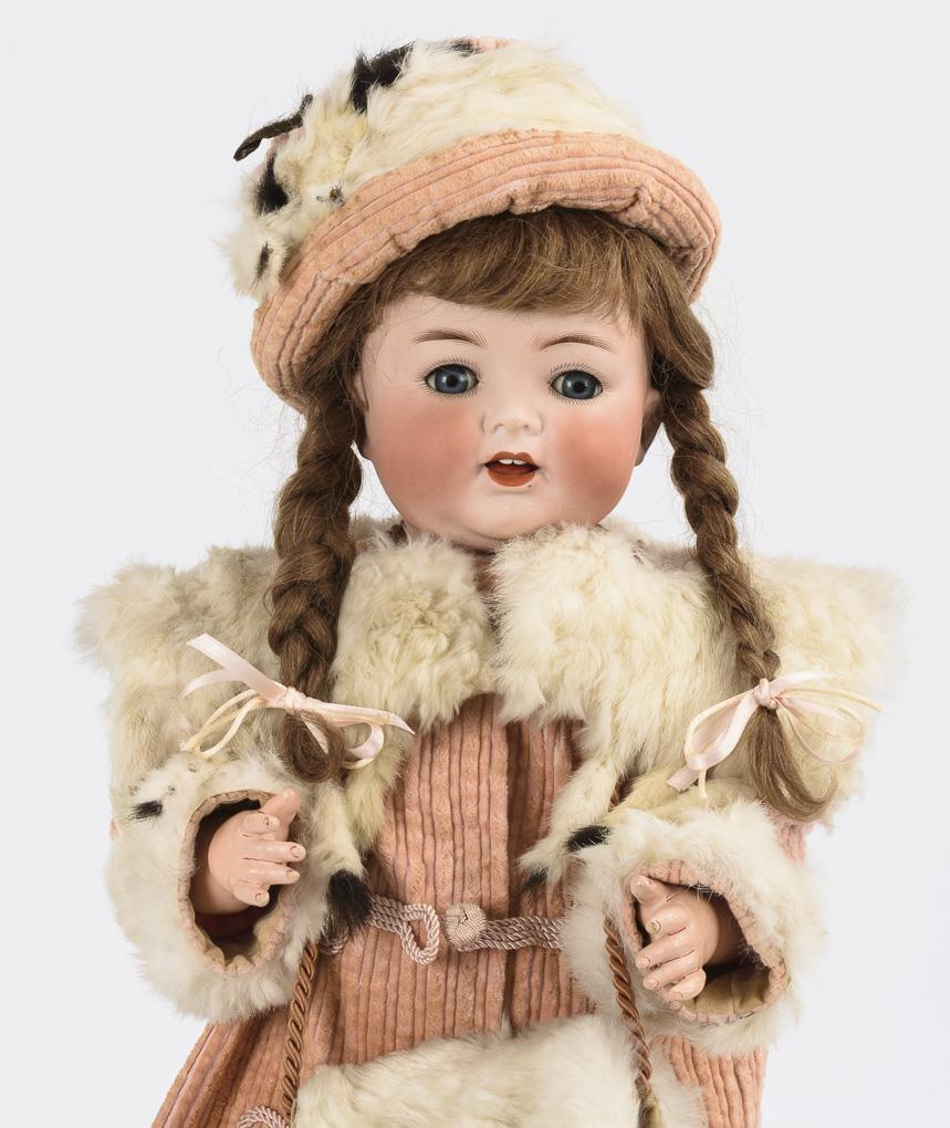 Crank head, blue sleeping eyes, eyelashes, medium blond human hair wig with braids. 5-piece stand-up doll body with silenced voice. White dress, pink coat, matching hat, white ermine collar and muff, white shoes. Head x-rayed: without defects.