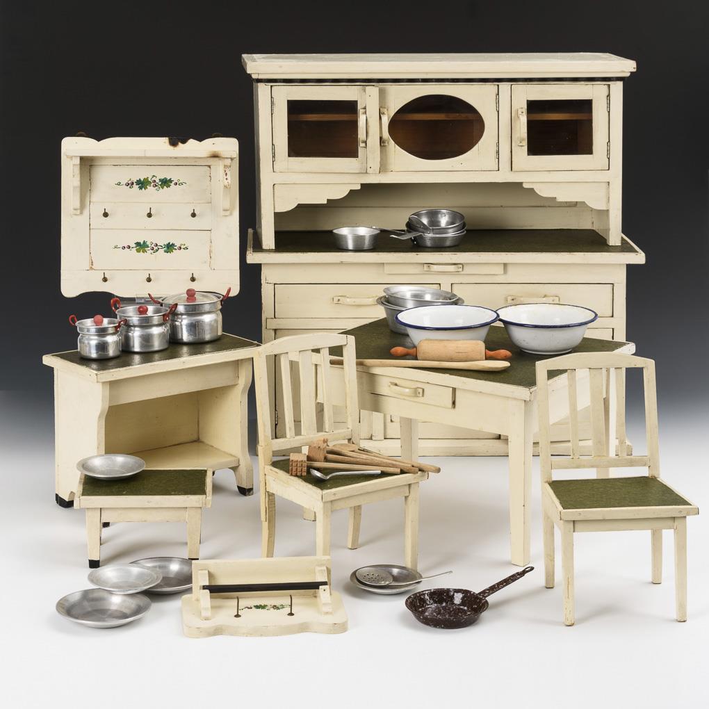 For the large doll kitchen: kitchen cabinet with glazed top, table, 2 chairs, stool, sideboard and 2 wall shelves. In addition, about 20 pieces of cookware and 6 utensils made of wood. Slight signs of age.