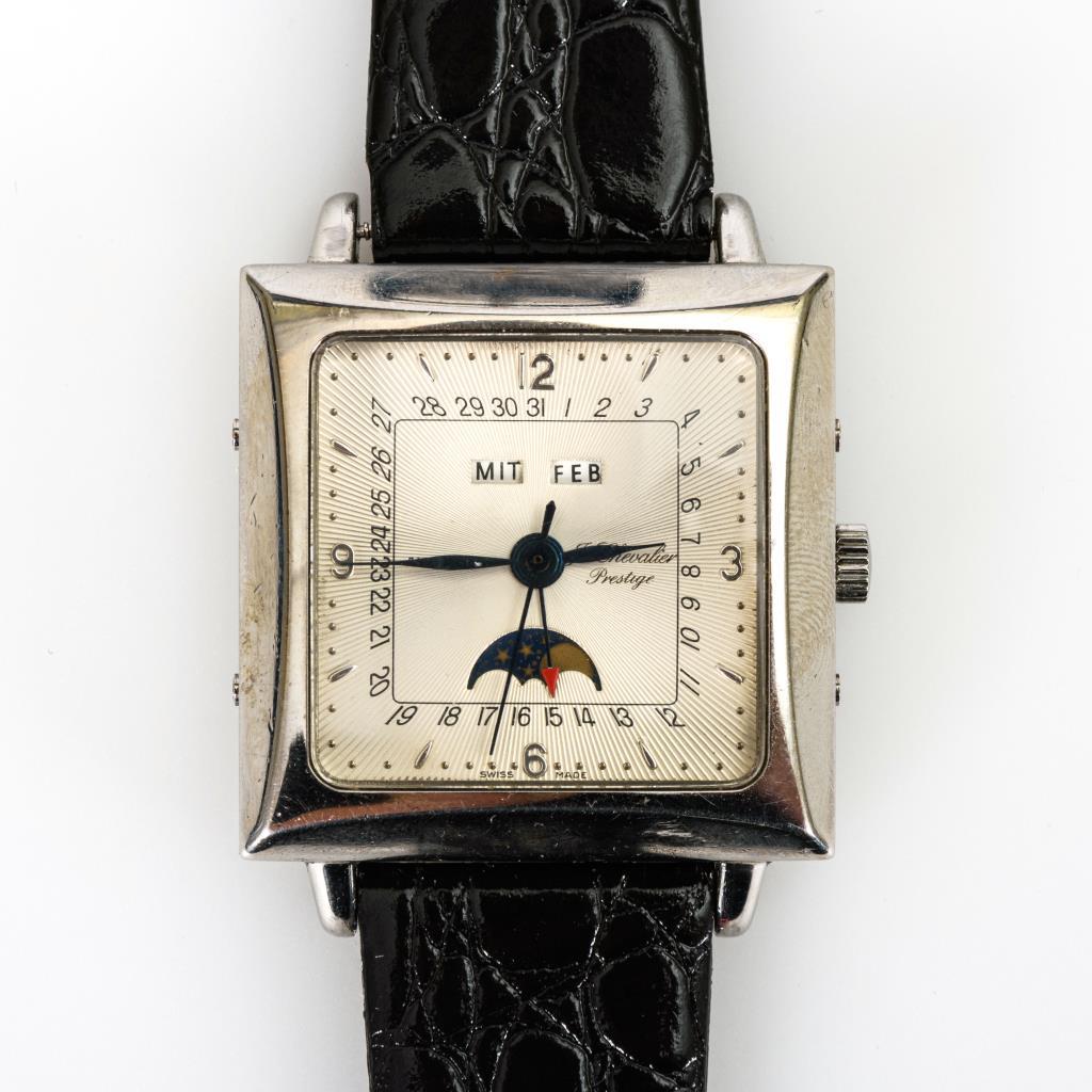 Werknummer: ETA 2892 A2.Referenznr.: 3182.Sichtbares Automatikwerk mit Stellkrone.Silbernes Zifferblatt mit arabischen Zahlen und gebläuten Blattzeigern, Minuterie, Zentralsekunde, Datumsanzeige mit Wochentag und Monat, Mondkalender, seitliche Schnellschaltung.Herstellerprägung Anzeige: "J. Chevalier Prestige".