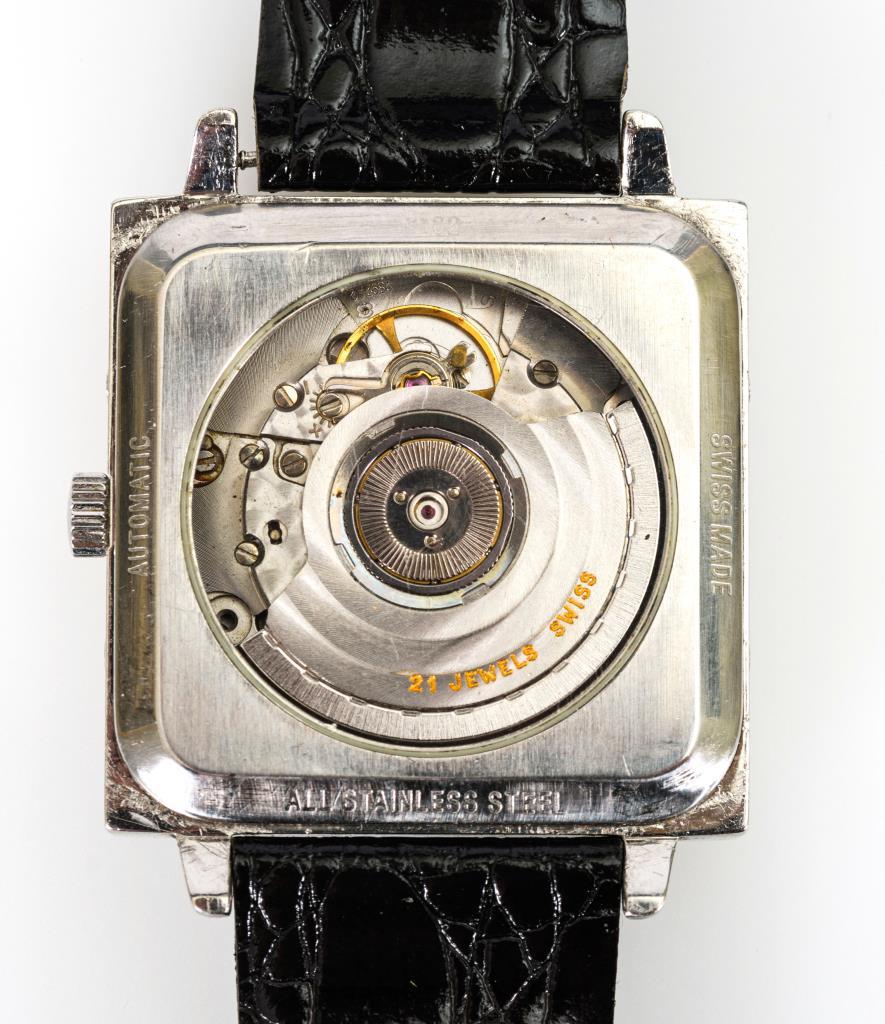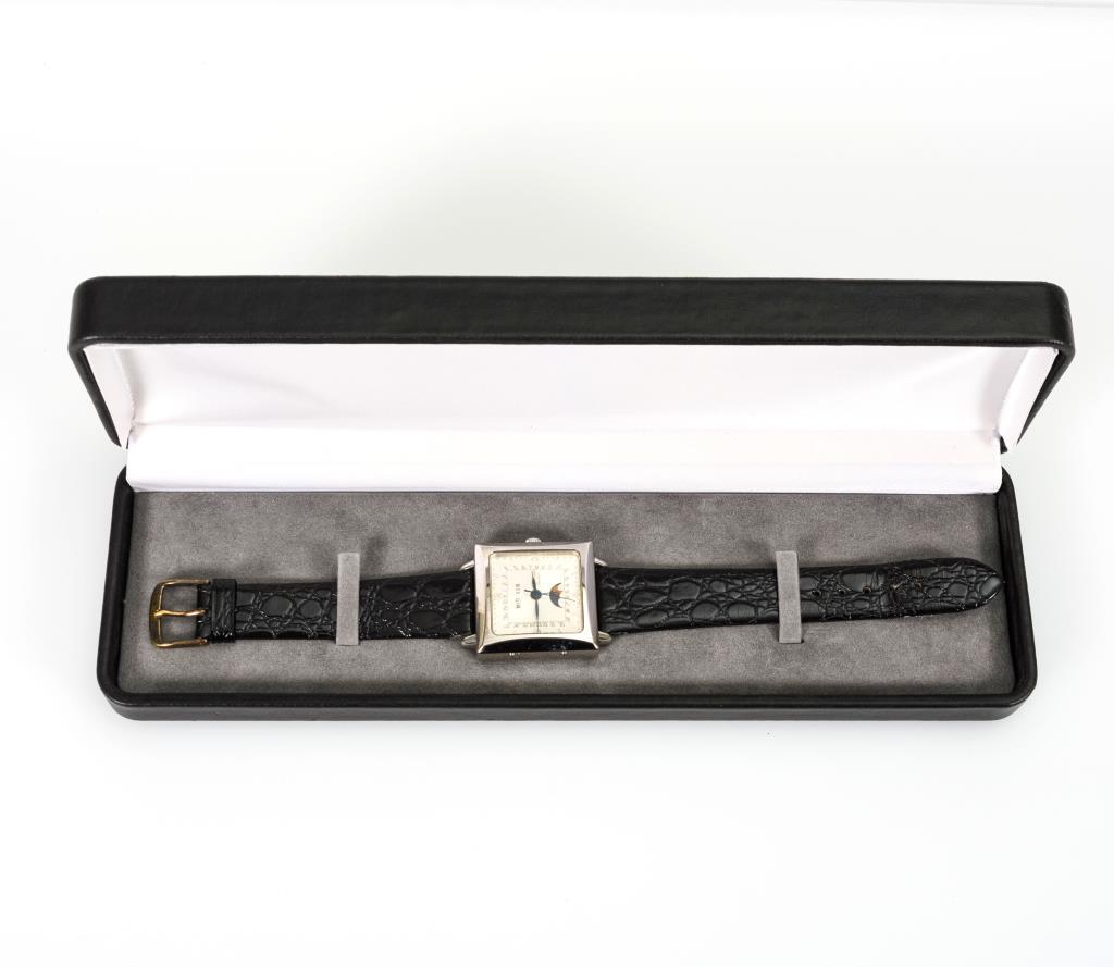 Edelstahl. Quadratisches Gehäuse an schwarzem Lederband. Werk läuft.Minimale Alters- und Gebrauchsspuren.