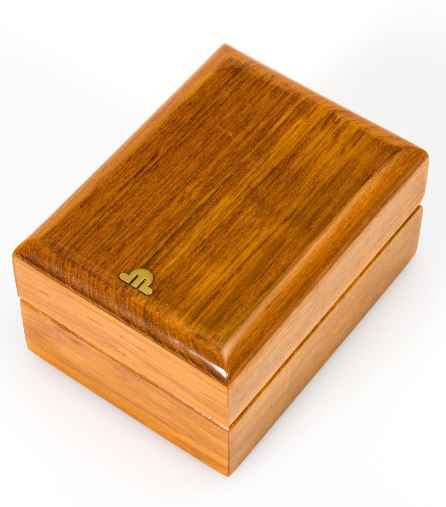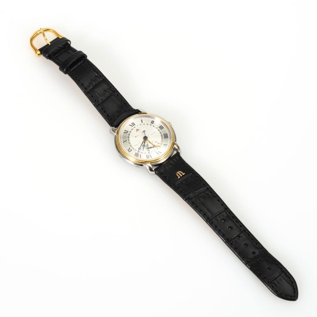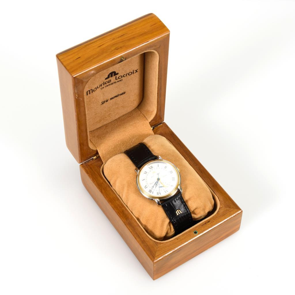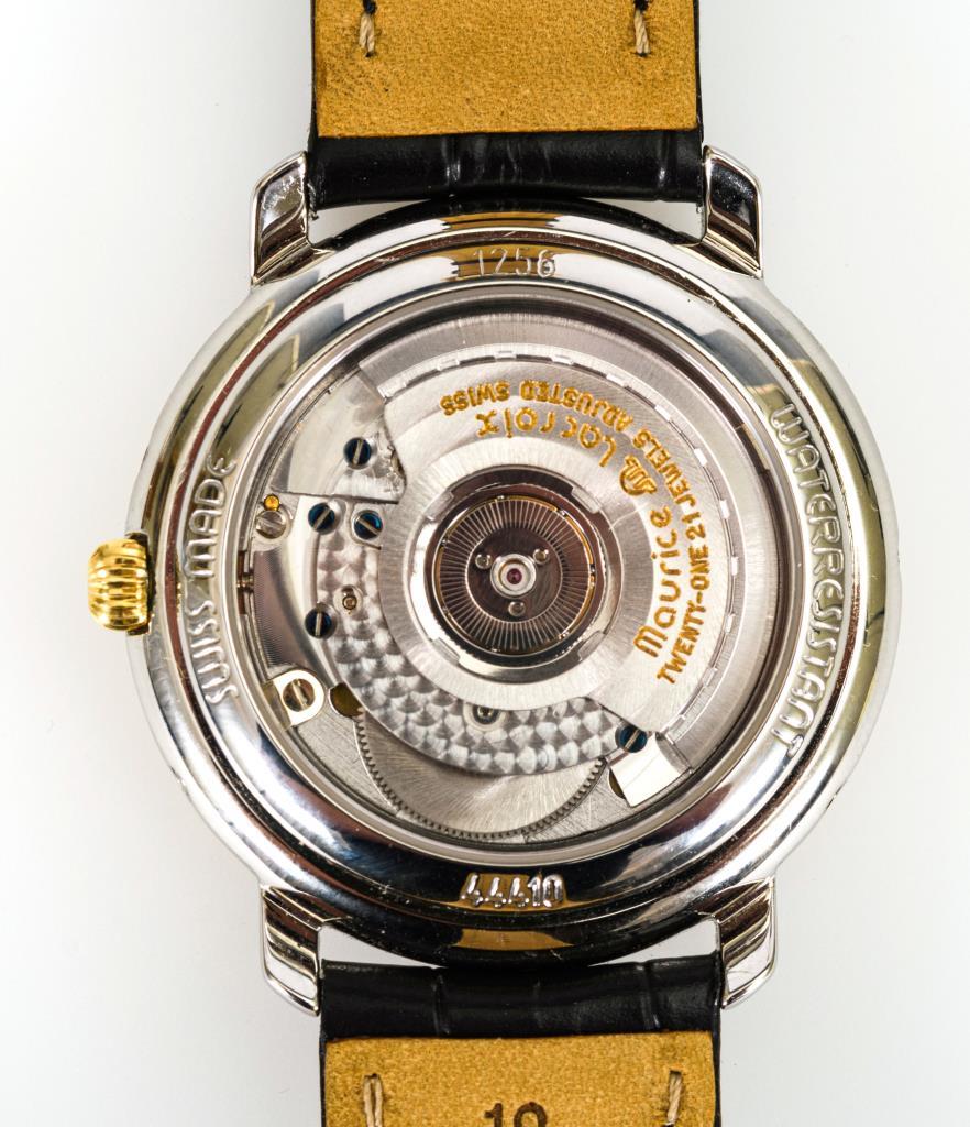 Werknummer: ETA 28922.Gehäusenummer: 1256.Referenznr.: 44410.Sichtbares Automatikwerk mit Stellkrone.Saphirglas, silbernes Zifferblatt mit römischen Zahlen und gebläuten Lochzeigern, Minuterie, Zentralsekunde, Datumsanzeige mit Wochentag und Monat, 24-Stundenanzeige, seitliche Schnellschaltung mit Stellstift.Herstellerprägung Anzeige: "Maurice Lacroix".