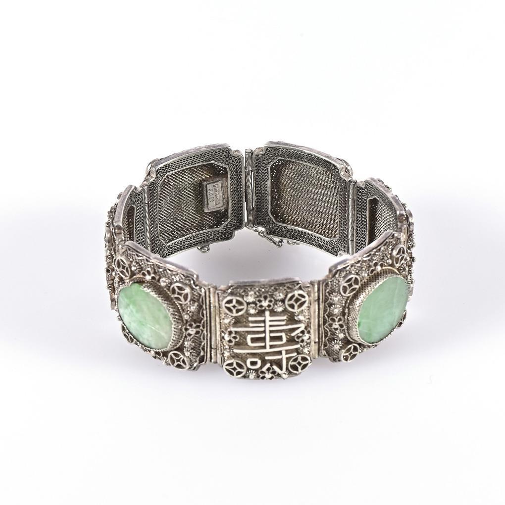 4 filigree links with jade discs set in circles and 3 links with characters. Box lock with safety chain.