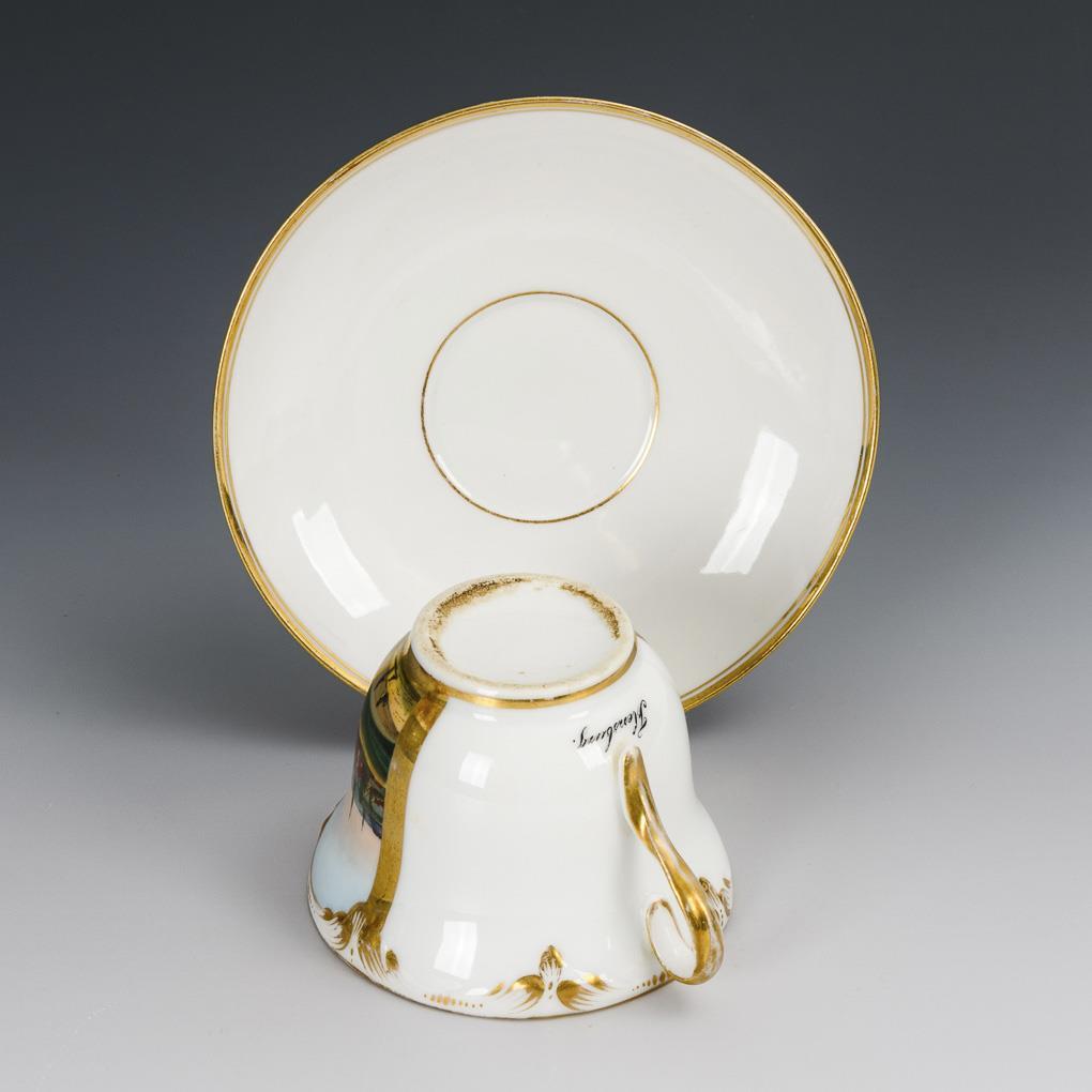 Polychrome painted, gold decorated. H cup 7 cm, Ø supplemented saucer 15.5 cm.
