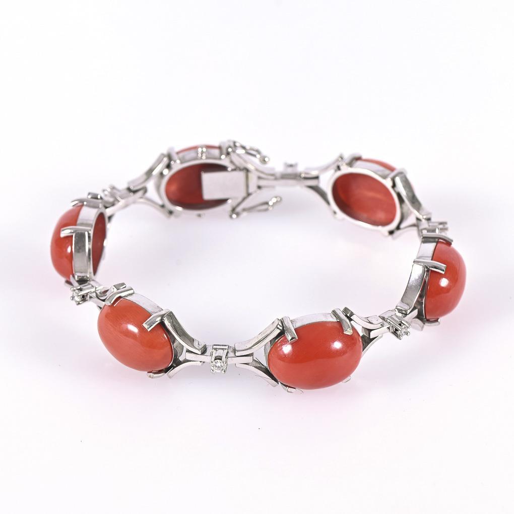 6 claw-set coral cabochons and 6 small diamonds, on box lock with 2 eight-locks.