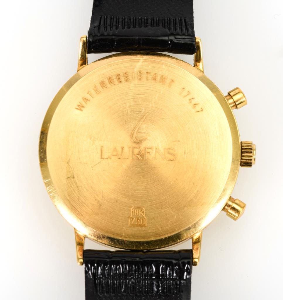 Referenznr.: 17447.Quarzwerk mit Stellkrone.Goldfarbenes Zifferblatt mit römischen Zahlen, Minuterie, Hilfszifferblätter für kleine Sekunde, Stunden, Minuten und Datum, Stoppuhrfunktion, 2 seitliche Drücker.Herstellerprägung Anzeige: "Laurens chronographe".