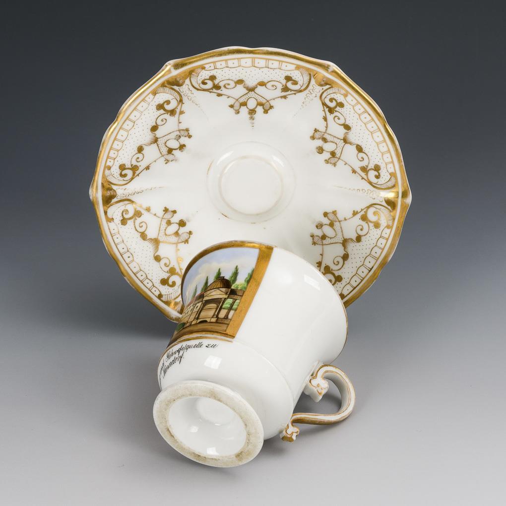 Footed bell cup with three-pass handle. On the front a gold-framed rectangular cartouche with the inscribed view of the bathhouse and sulfur spring in Bad Nenndorf. Gold somewhat rubbed, hairline crack on the edge of the saucer.