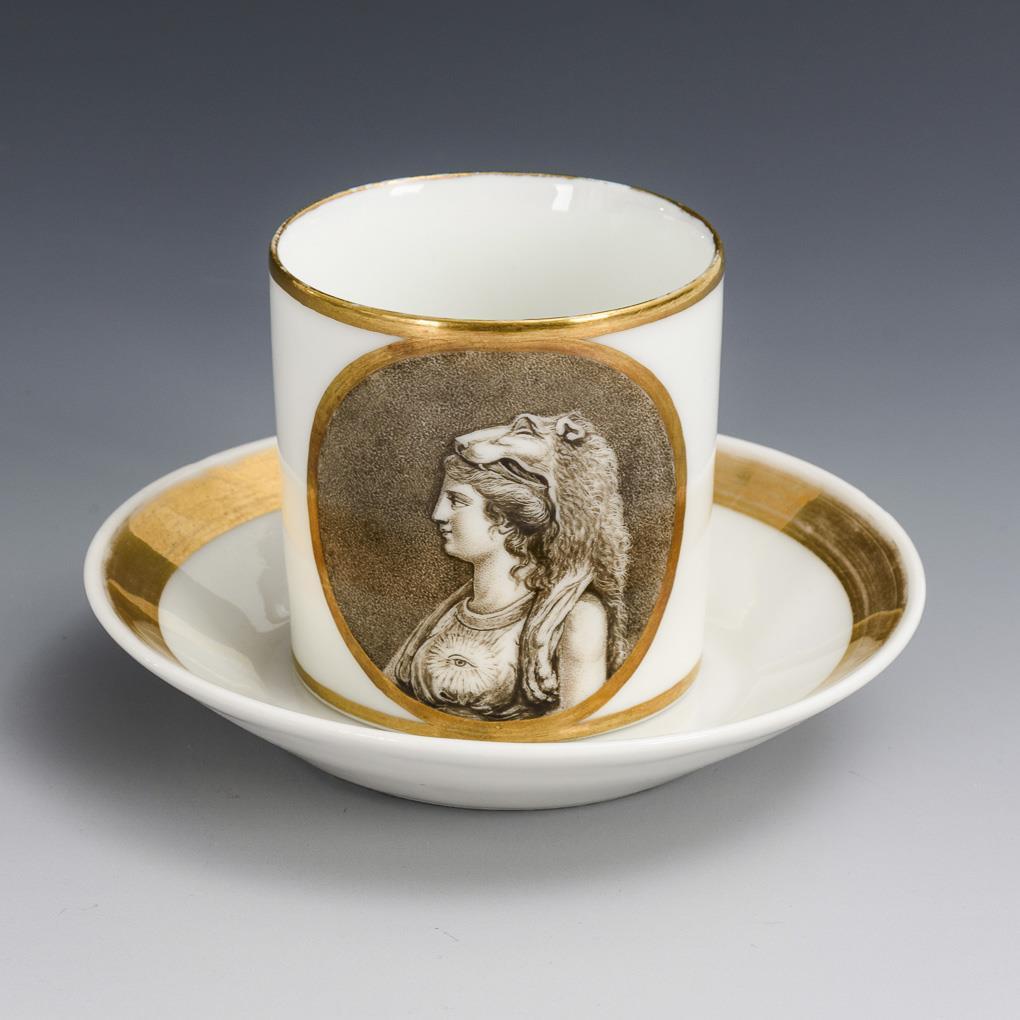 Cylinder cup with ear handle. On the front a gold-framed medallion with the Masonic? motif of a young woman dressed in antique style with lion skin and "seeing eye". Minimal gold abrasion.