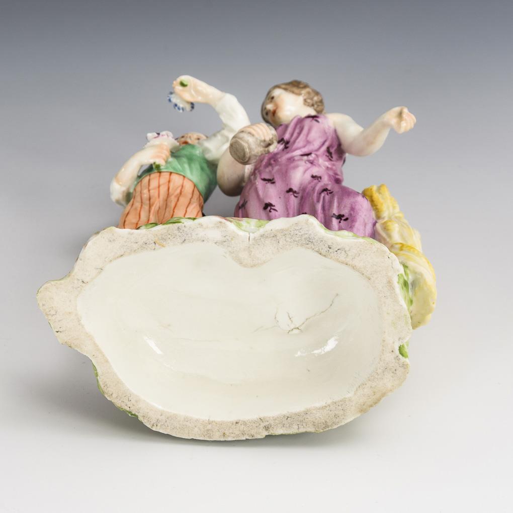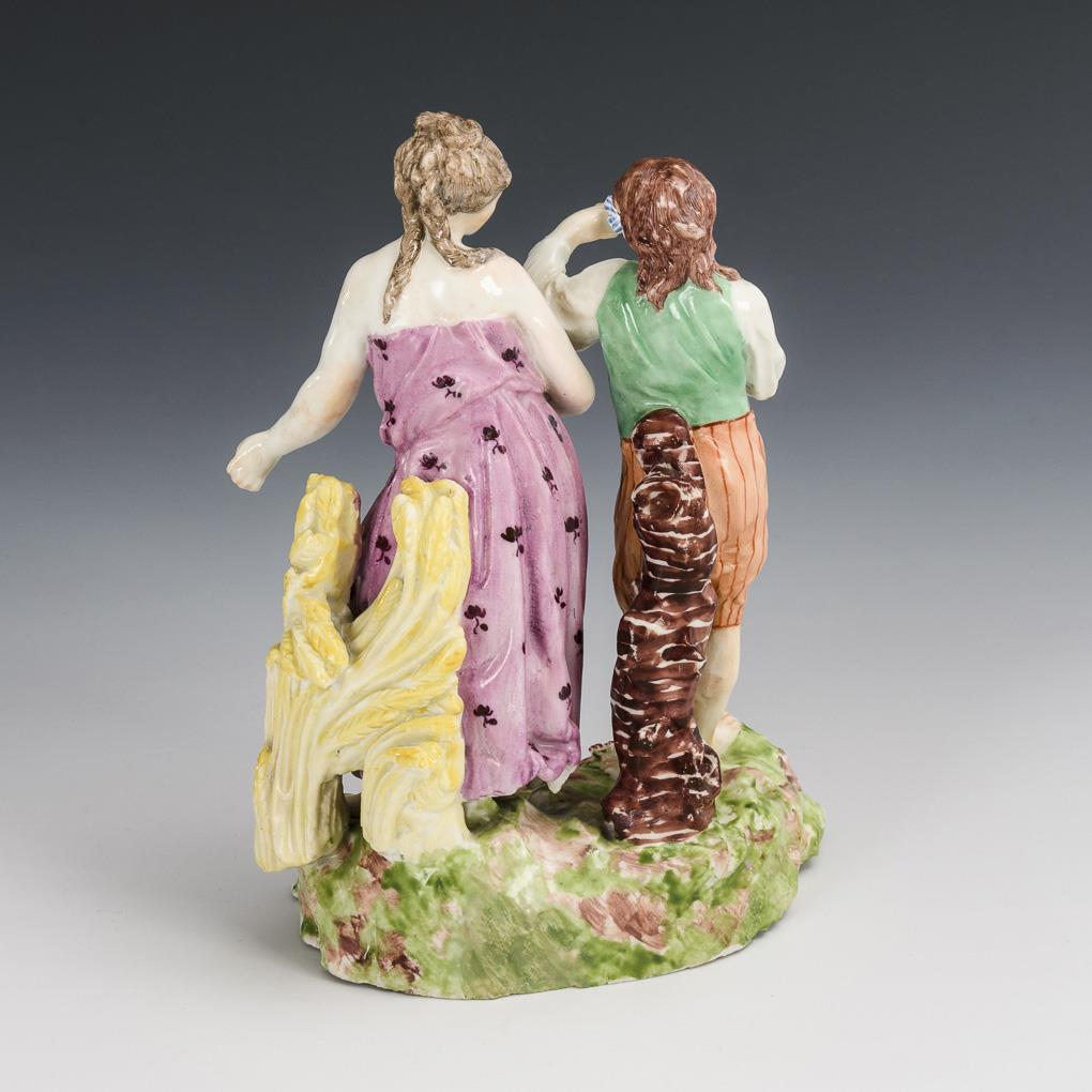 On a natural base standing young man with flowers as an allegory of spring, and a lady standing on bunches of ears of corn as an allegory of summer. Base edge with bumping and restoration, both arms of the lady and back of the gentleman restored.