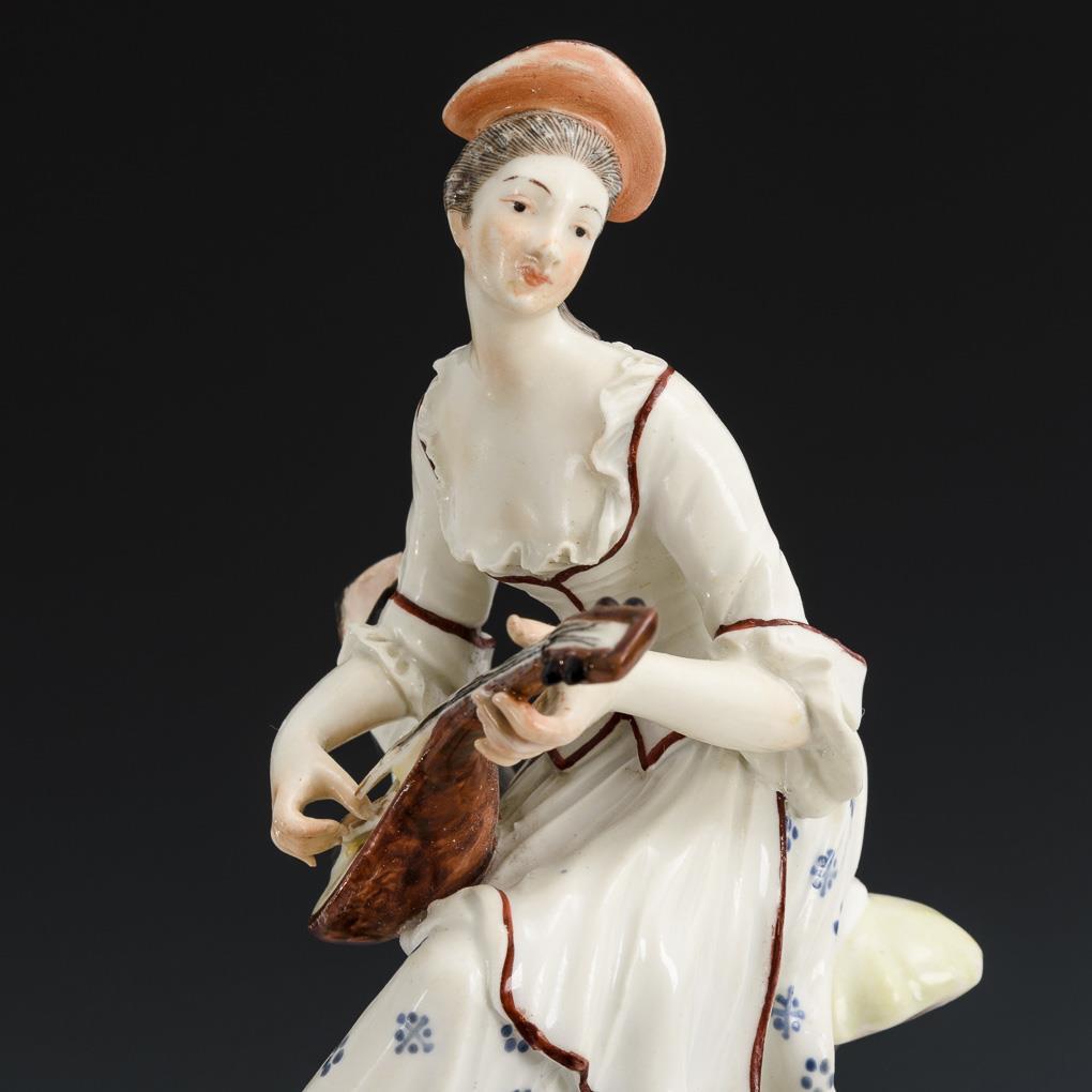 Sitting on a rock pedestal, playing a lute young lady with lamb. Fire crack in the strings, left shoe, lute neck, left hand and left sleeve ruff restored.