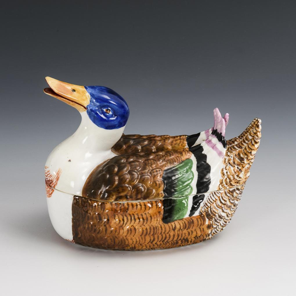 Paste box designed in the shape of a duck. Lid restored, 3 chips on the inside rim of the box.