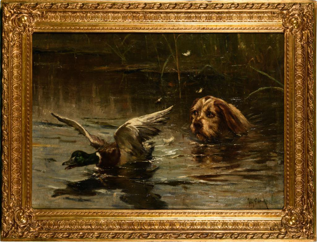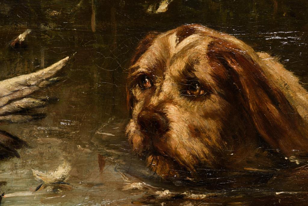 Jagdhund im Wasser nahe einer flüchtenden Ente. Drei kleine restaurierte Stellen.