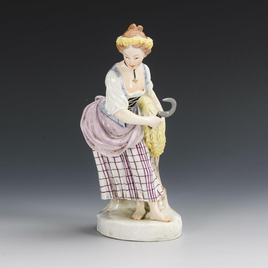 A young peasant woman standing at a tree stump with sheaf and sickle. Sickle restored, 1 ear tip bumped at the hair crown, somewhat wobbly stand.
