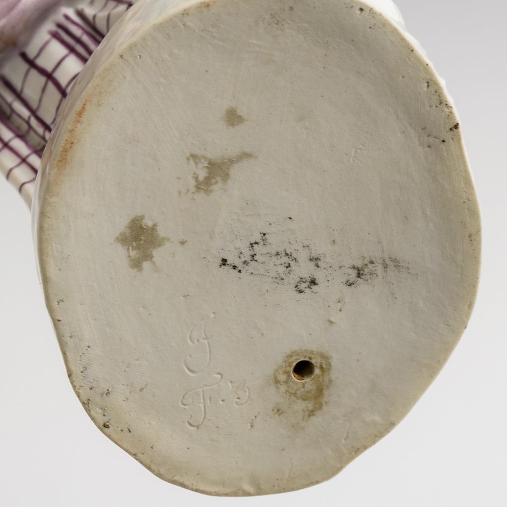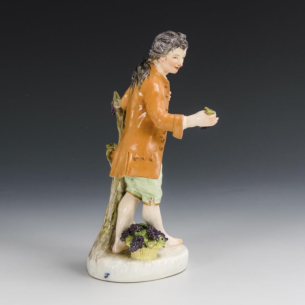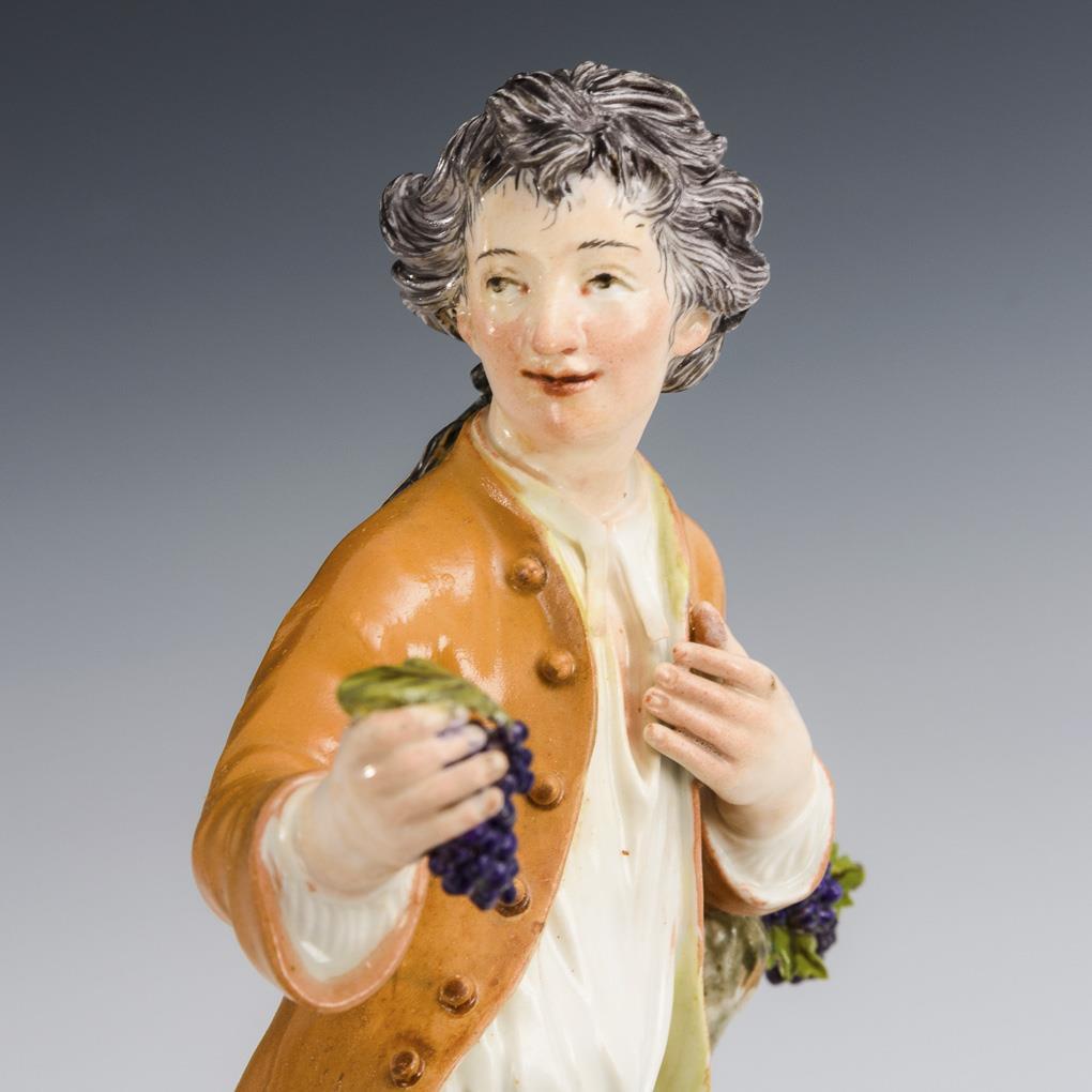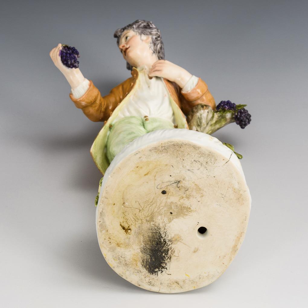 Vintner standing on a vine with grape basket and grapes. Right arm, part of hair bow and partial leaves and grapes restored, 2 fire cracks on base.