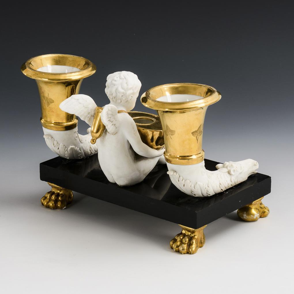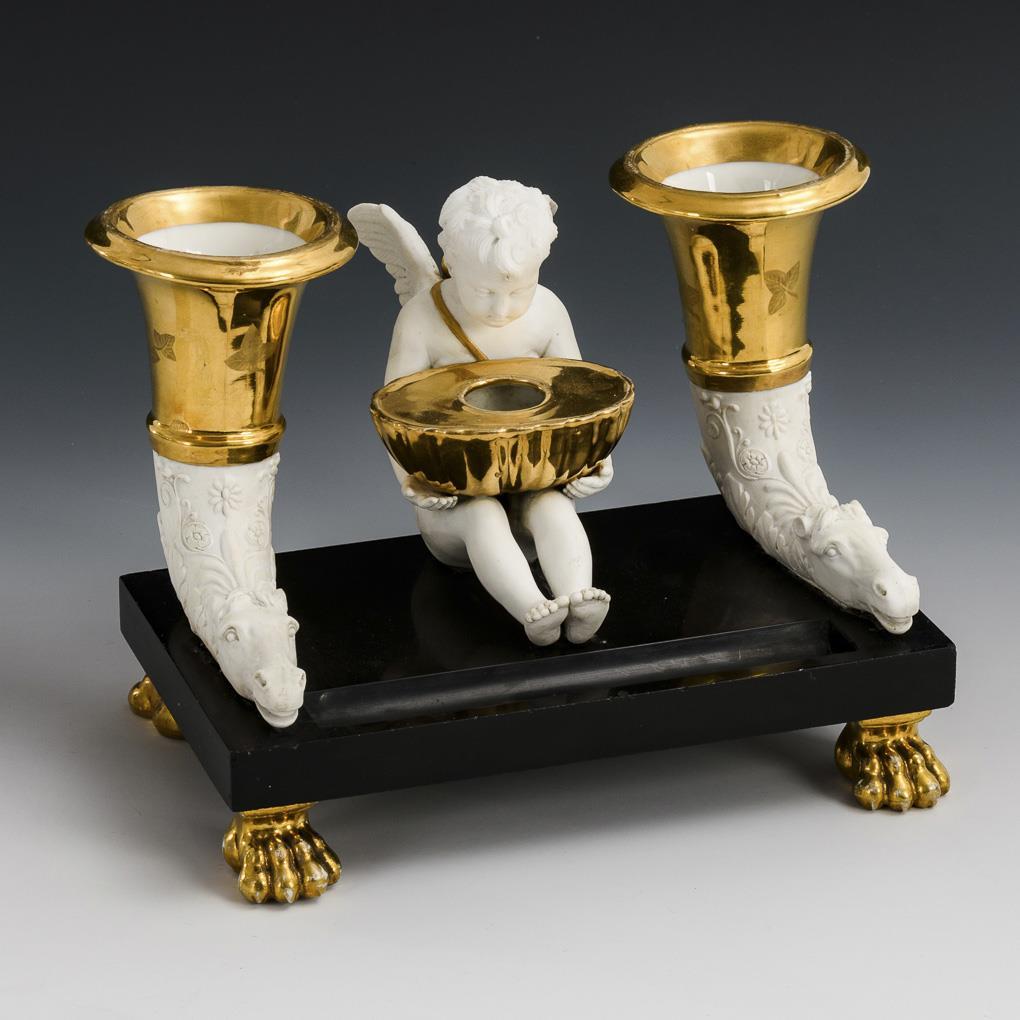 On a black stone plate with four paw feet and pen tray two cornucopias with horse head finial, centered a seated angel holding the oval inkwell. Partial gold abrasion, bumps on the stone, 1 cornucopia restored.