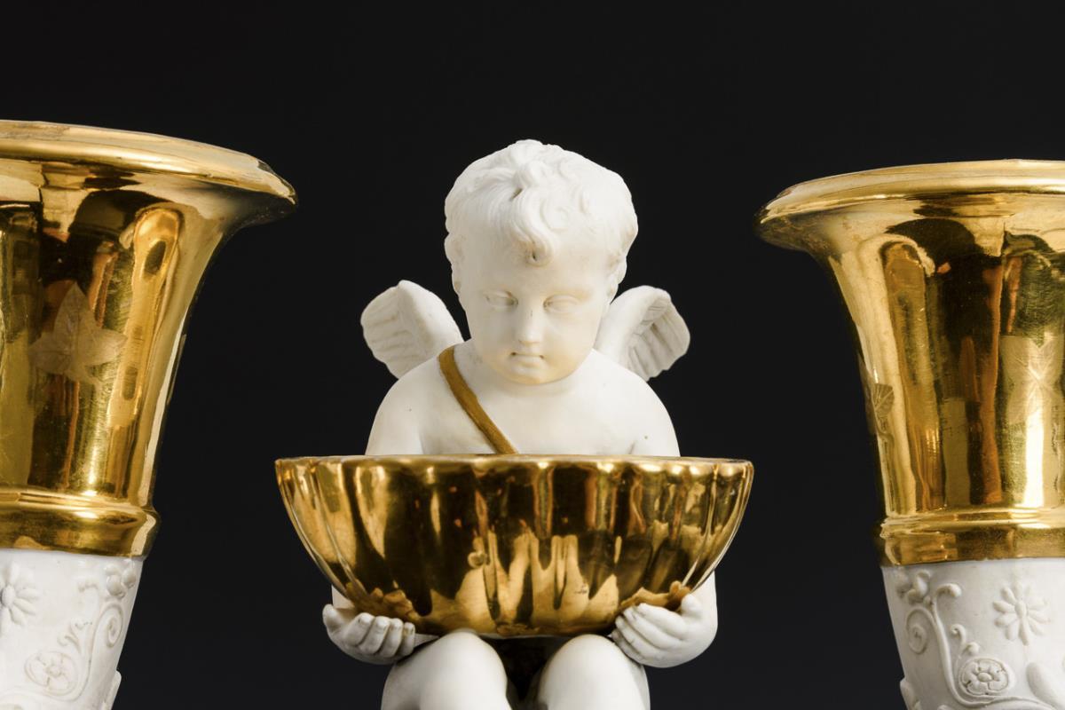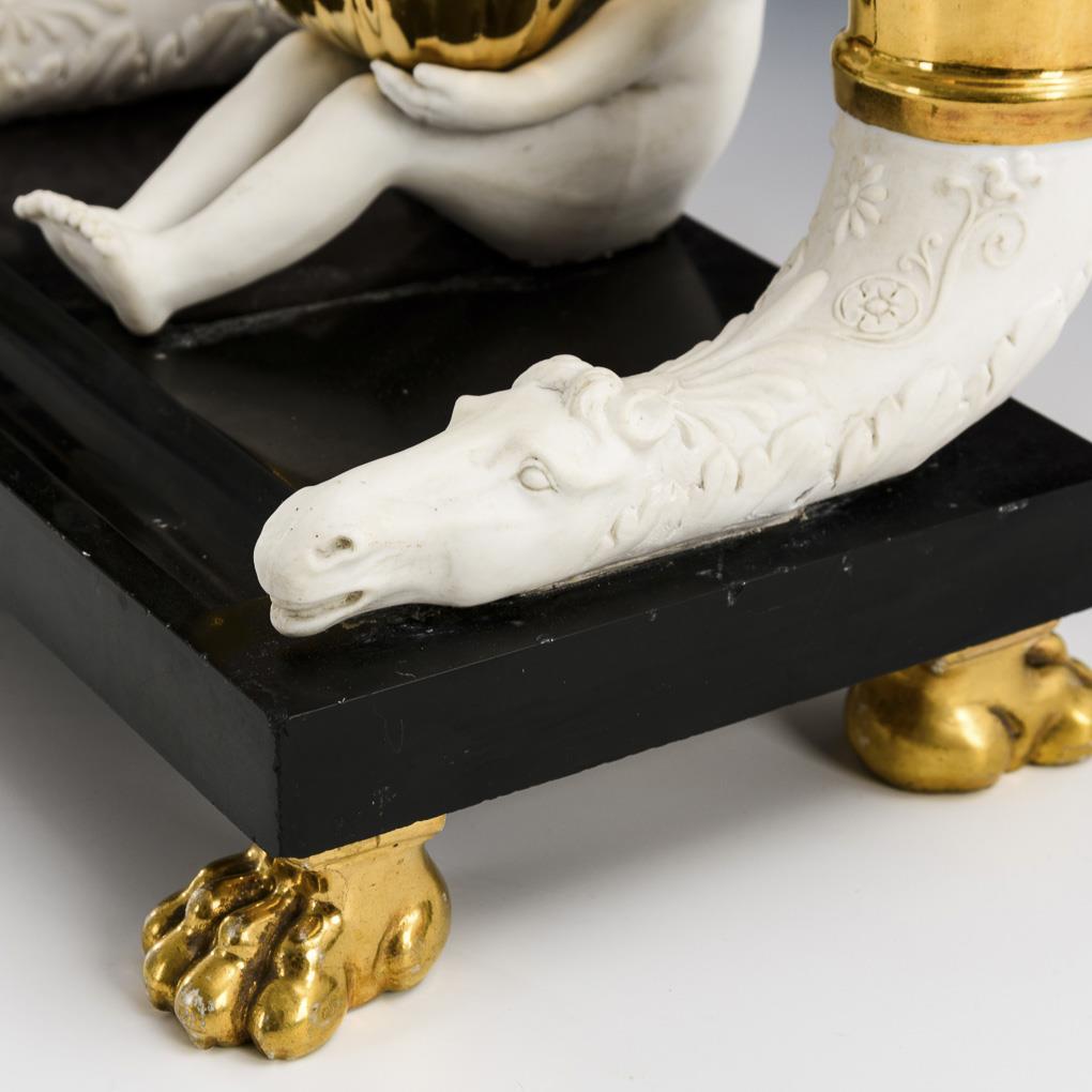 Biscuit porcelain, gold staffage; black stone. 17.5 x 22 x 14 cm.