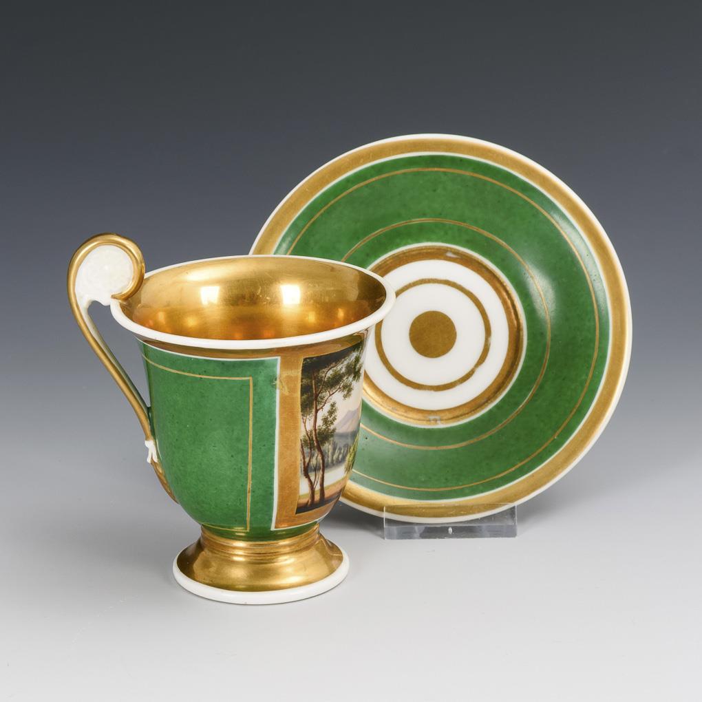 Footed bell cup with rosette handle. Green background, on the outside a gold-framed rectangular cartouche depicting a river landscape with castle and staffage.