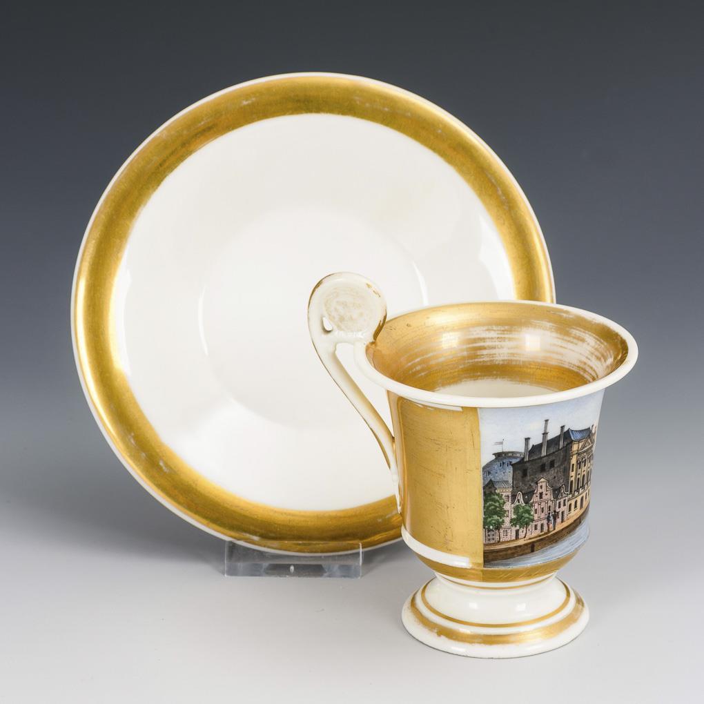 Footed crater cup with bisque lion head handle. Gold background, on the outside a rectangular cartouche with the inscribed view of the house "Felix Meritis", which was the seat of the eponymous philanthropic society founded in 1777 and developed in the 19th century to a center of culture, science and technology. Gold somewhat rubbed.