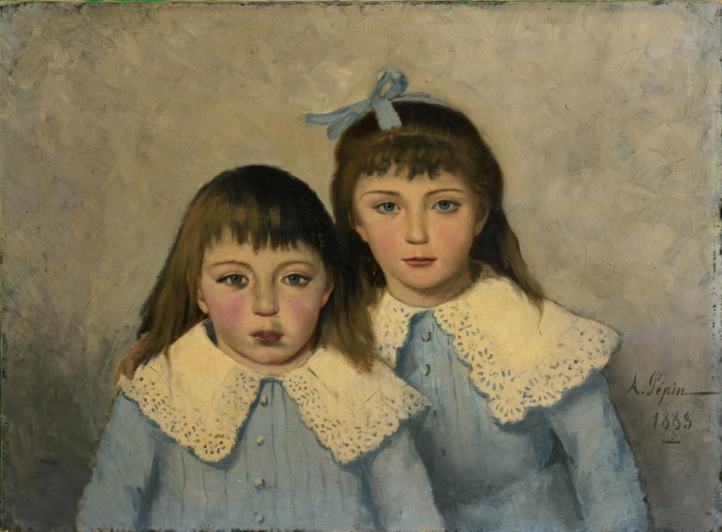Porträt zweier Mädchen in blauen Kleidern mit weißen Spitzenkragen. Leichte Altersspuren.