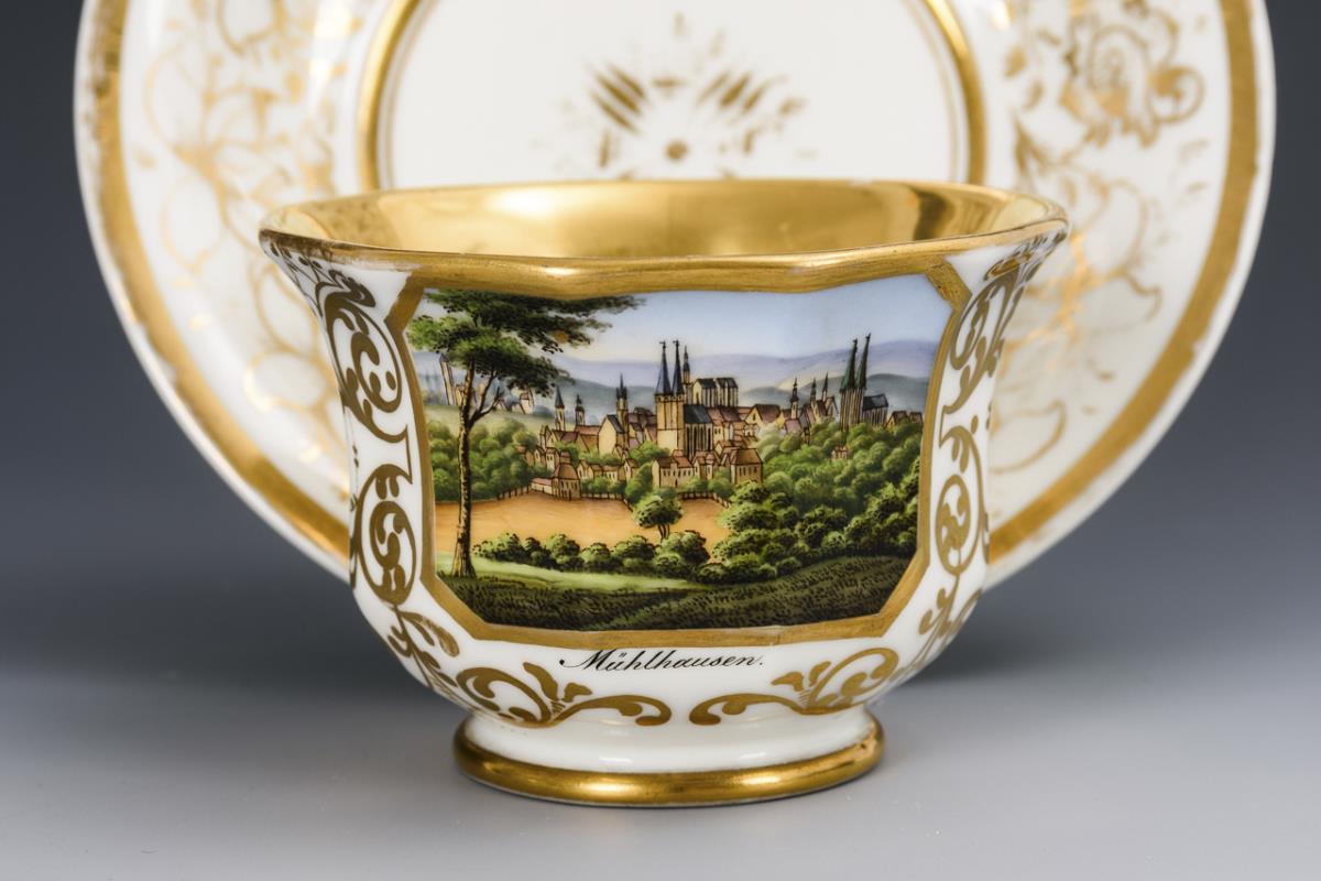 Footed bell cup with pointed curved handle. On the front a rectangular cartouche with the inscribed view of the Thuringian town of Mühlhausen, verso ornamental gold painting. Wall hairline crack, minimal gold wear.