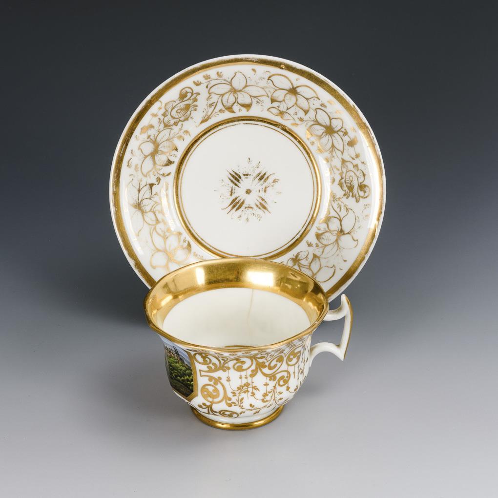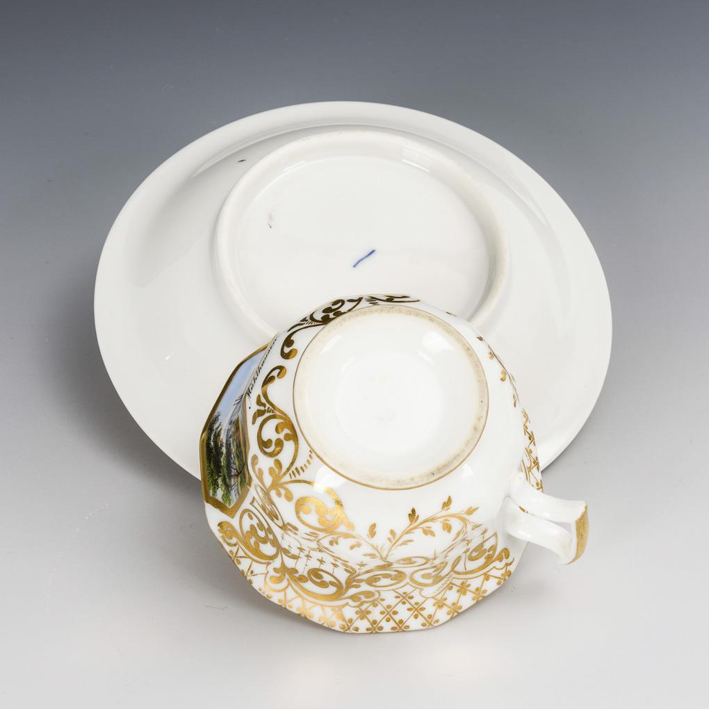Polychrome painted, gold decorated. H cup 6 cm, Ø supplemented saucer 15 cm.