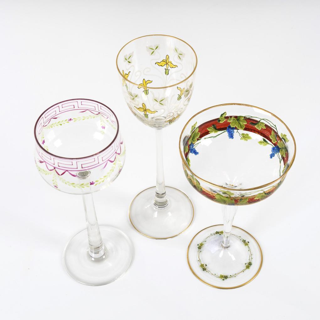 Colorless glass, polychrome enamel painting, gold staffage. H 17,5-22 cm.