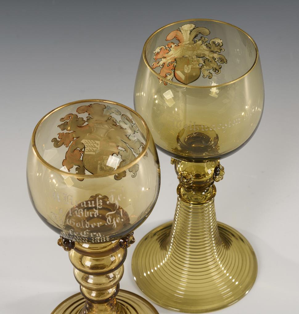 Bellied dome over variously fluted stem with fused berry nubs. On the front of each an enamel painted coat of arms, verso a dedication.